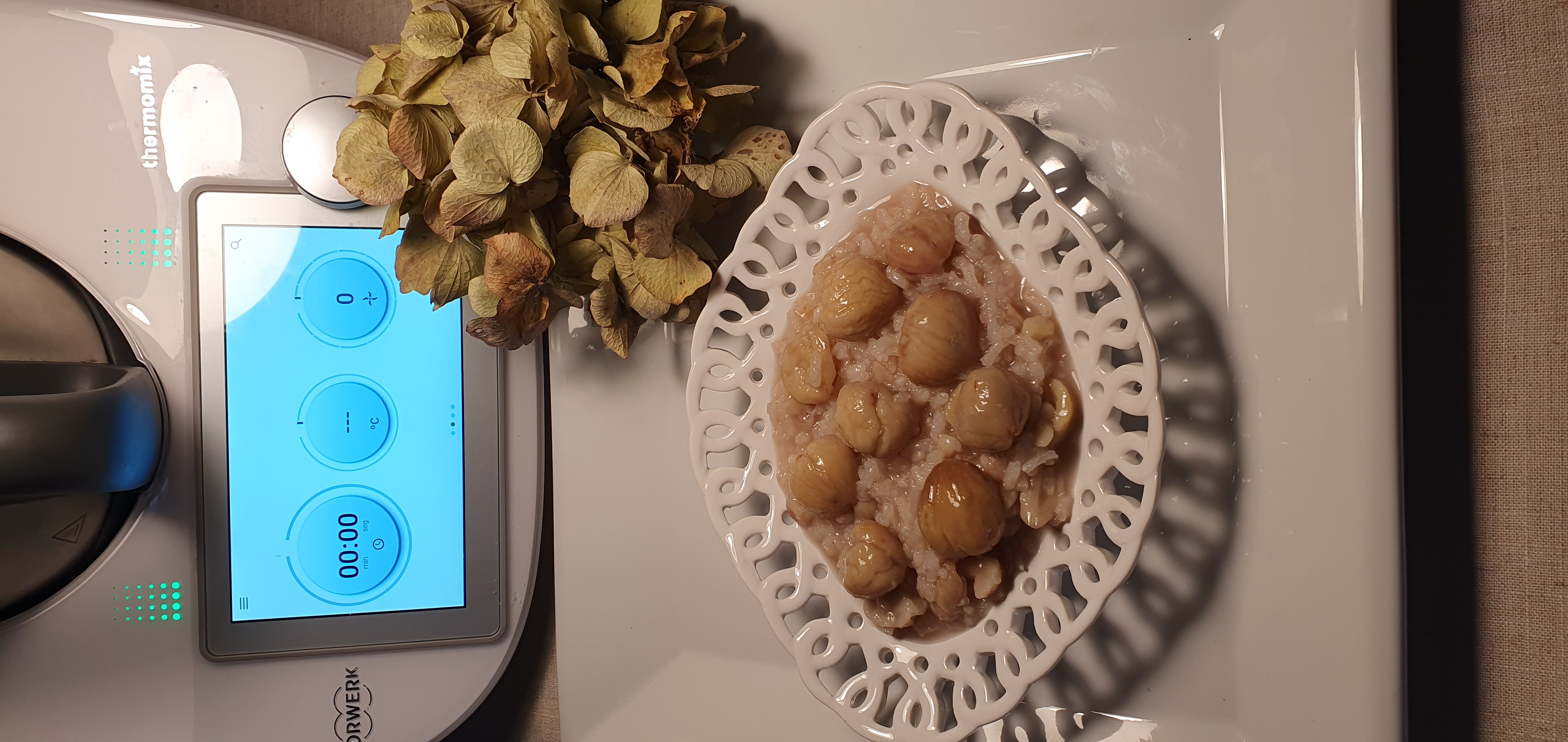 4- Una vez pasado los 45min sacamos el cestillo con las castañas y le pondremos los 200g de arroz y las castañas reservadas. Programe 15min Vel.1 y giro inverso.