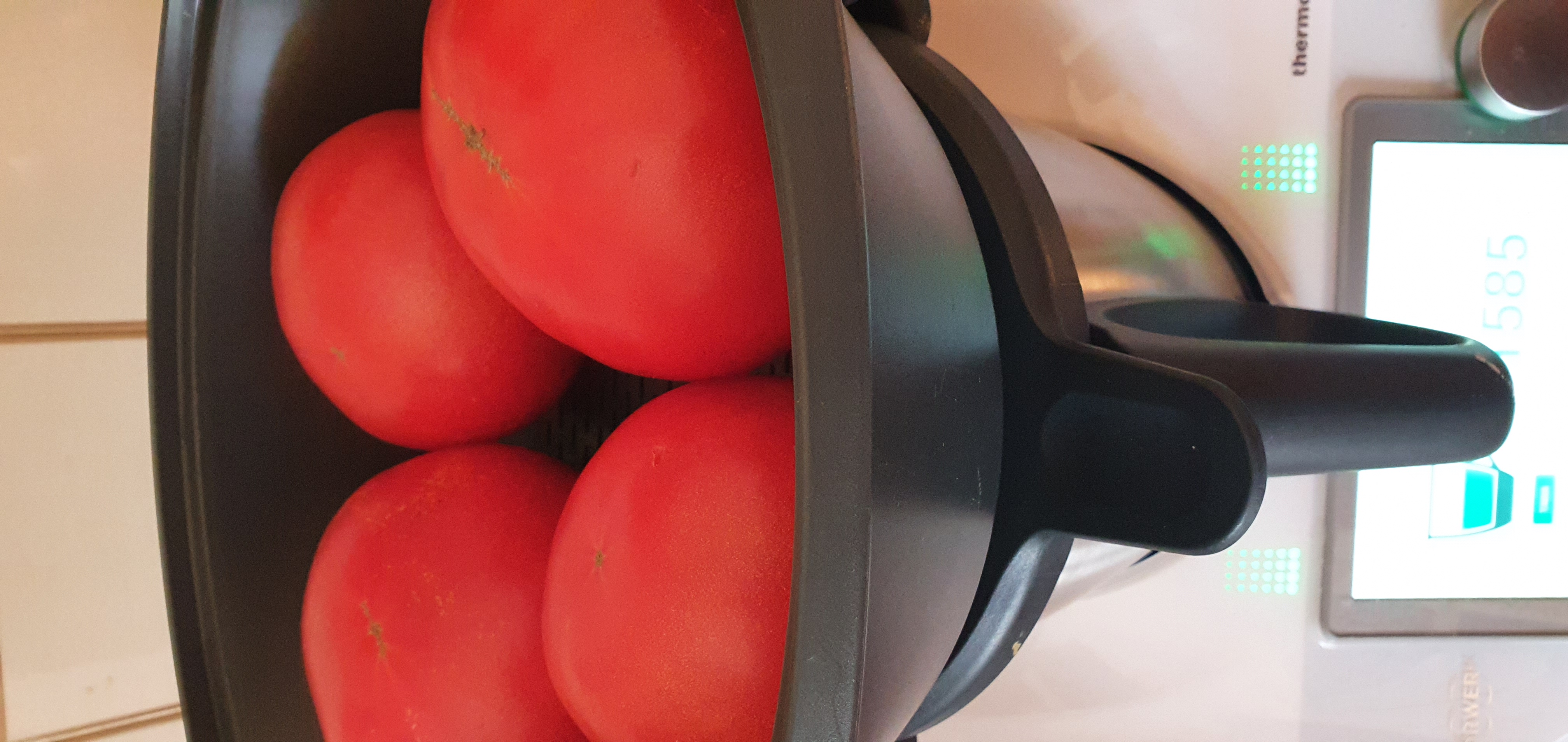 PASO 1 : Ponga el agua en el vaso y a continuación sitúe el recipiente varoma con los tomates para escaldarlos.