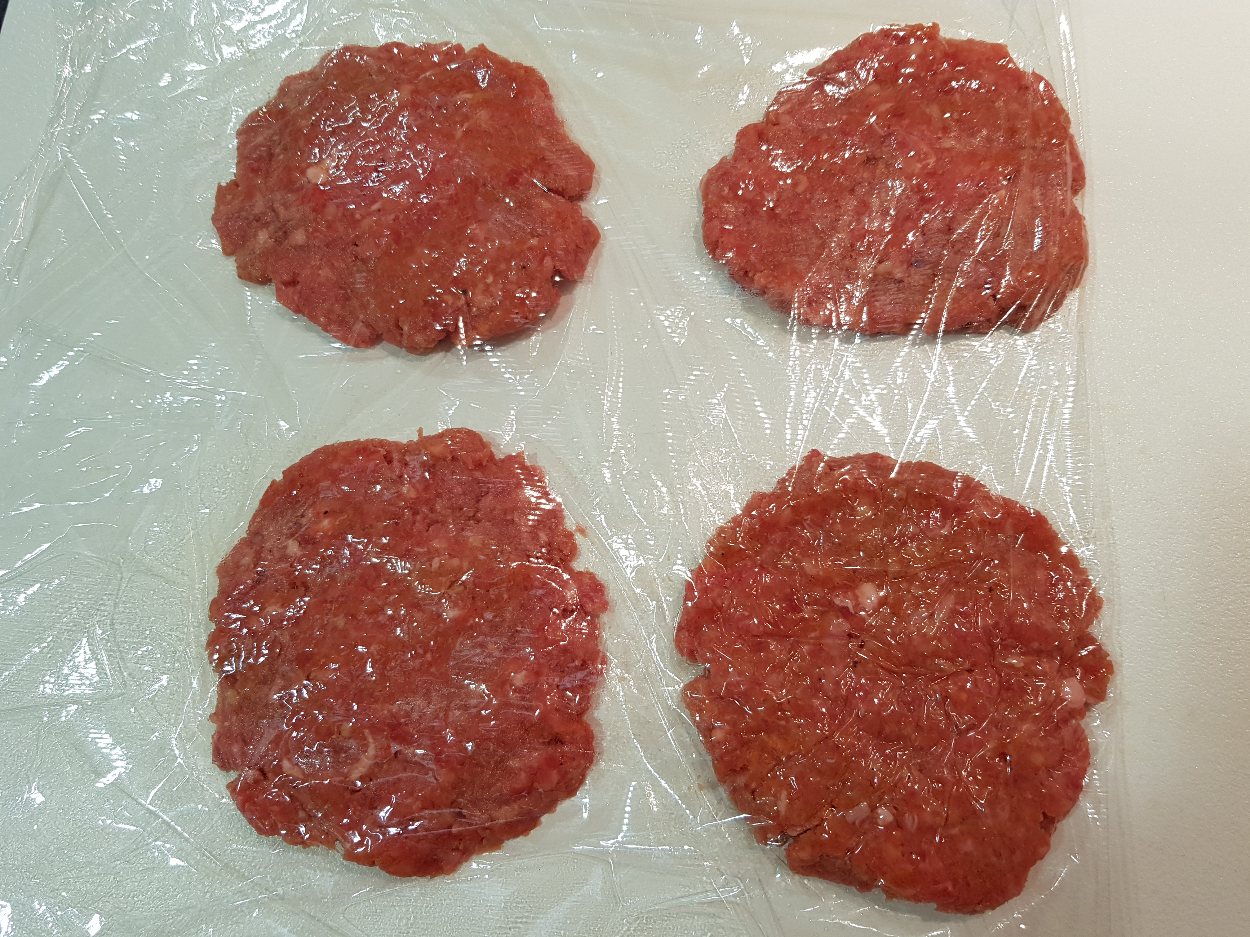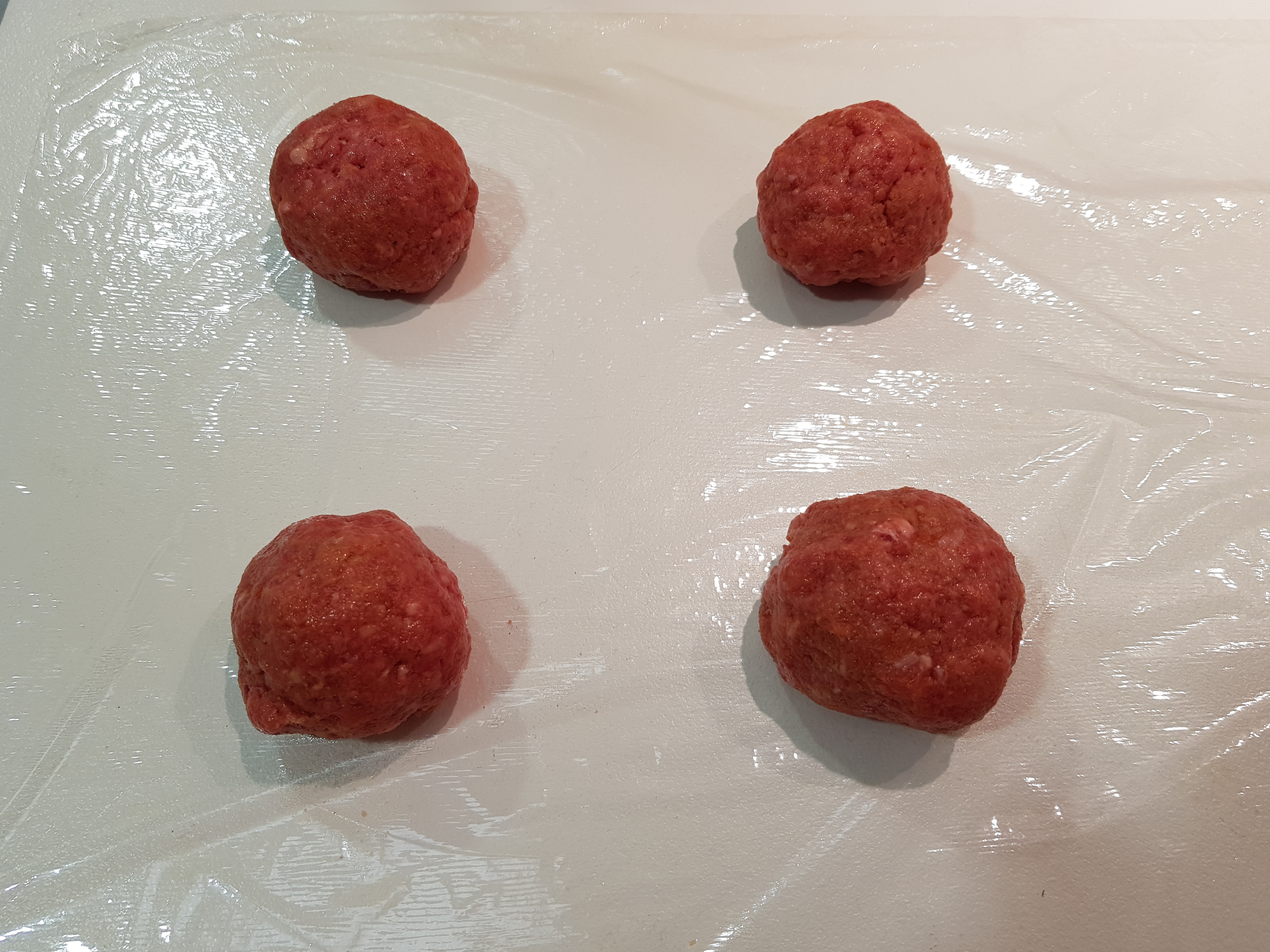 De la misma nada de las albóndigas puede sacar algunas hamburguesas, corte un trozo de film transparente y pongalo en la encimera ponga 4 albondigas un poco mas grande que las anteriores