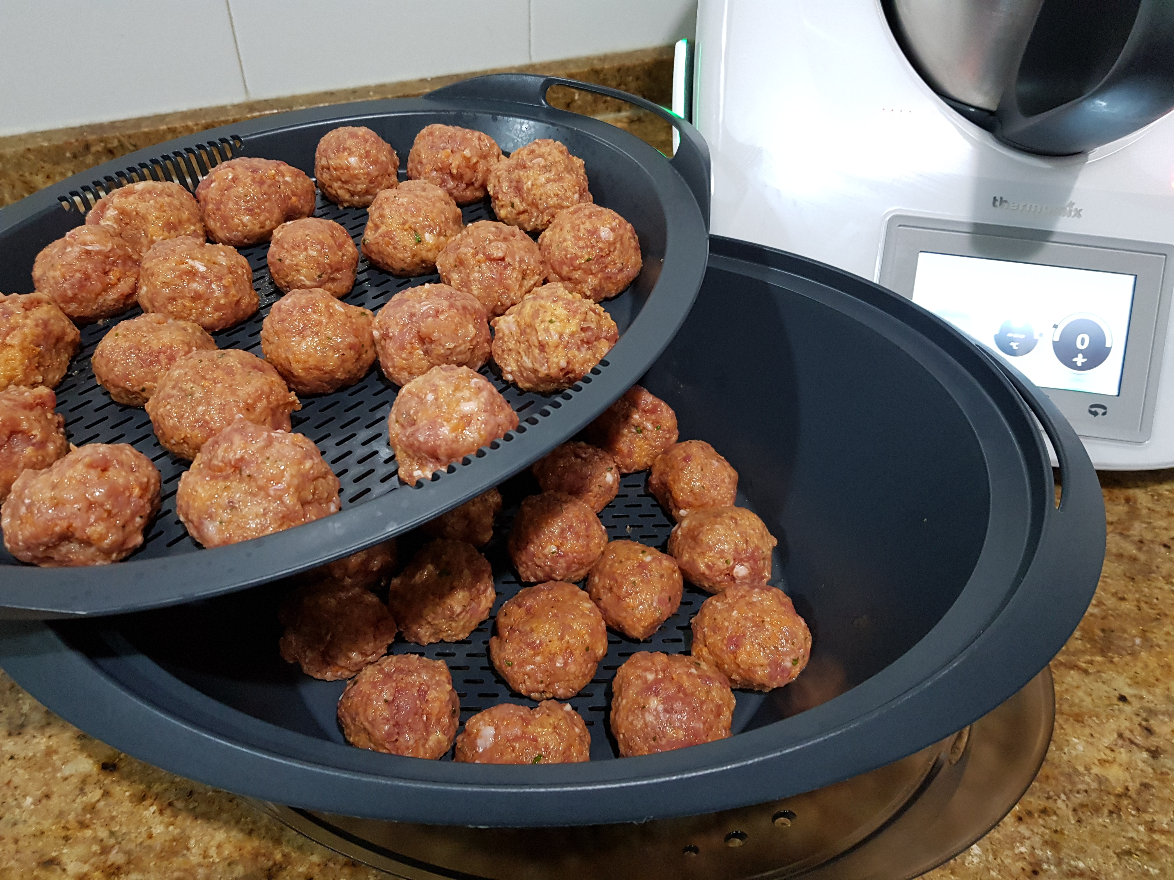 * Vaya haciendo bolitas manualmente con las manos mojadas en aceite y vaya colocándolas en el recipiente varoma y luego en la bandeja de manera que no tapone todos los agujeros del mismo, impidiendo así la entrada del vapor tal y como se ve en la foto, mientras tanto y sin enjuagar el vaso vaya haciendo el sofrito.