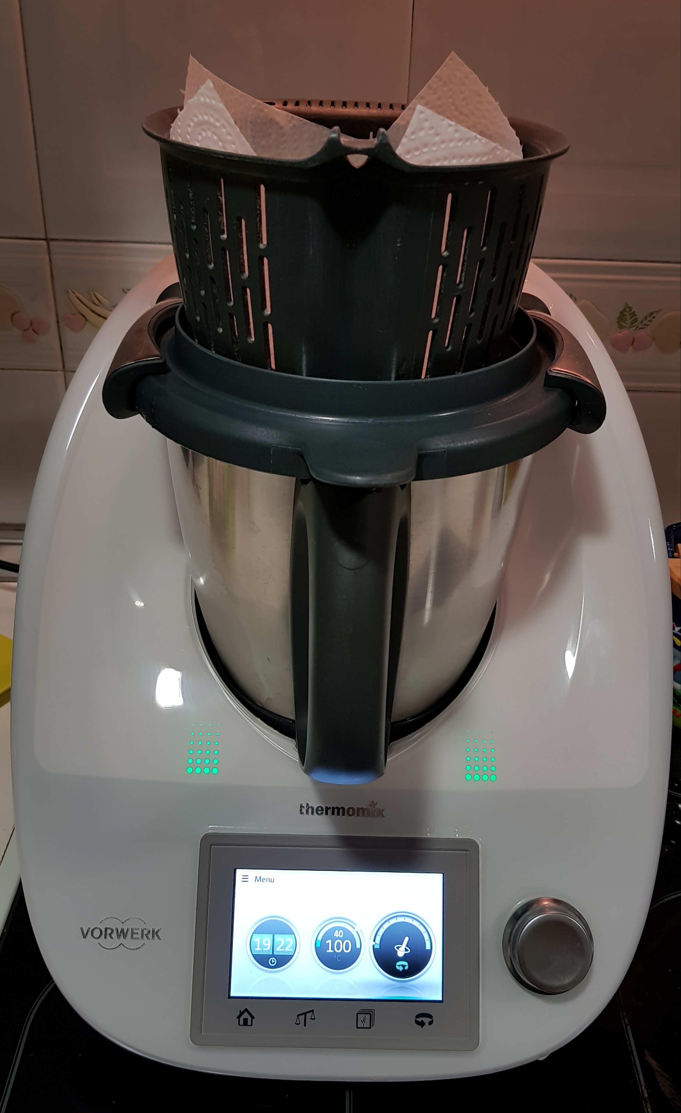 * A continuación, programe 15 minutos, temperatura Varoma, giro a la izquierda, velocidad 1, y en lugar del cubilete, coloque el cestillo sobre la tapa para facilitar la evaporación