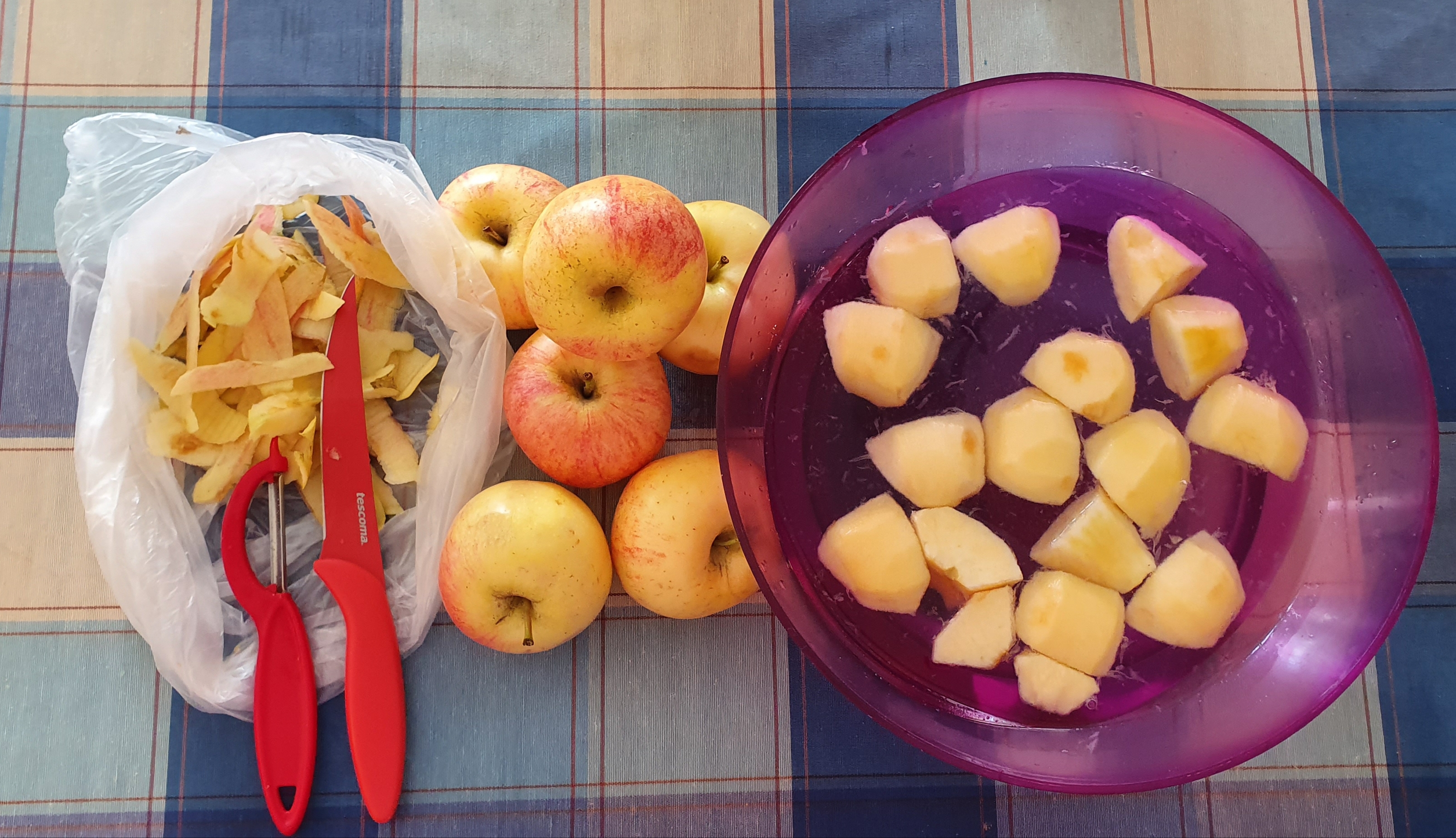 * Descorazone las manzanas de una en una y pele, corte en cuartos y cada cuarto en dos, sumerja en un bol con agua y zumo de medio limon, para evitar la oxidación