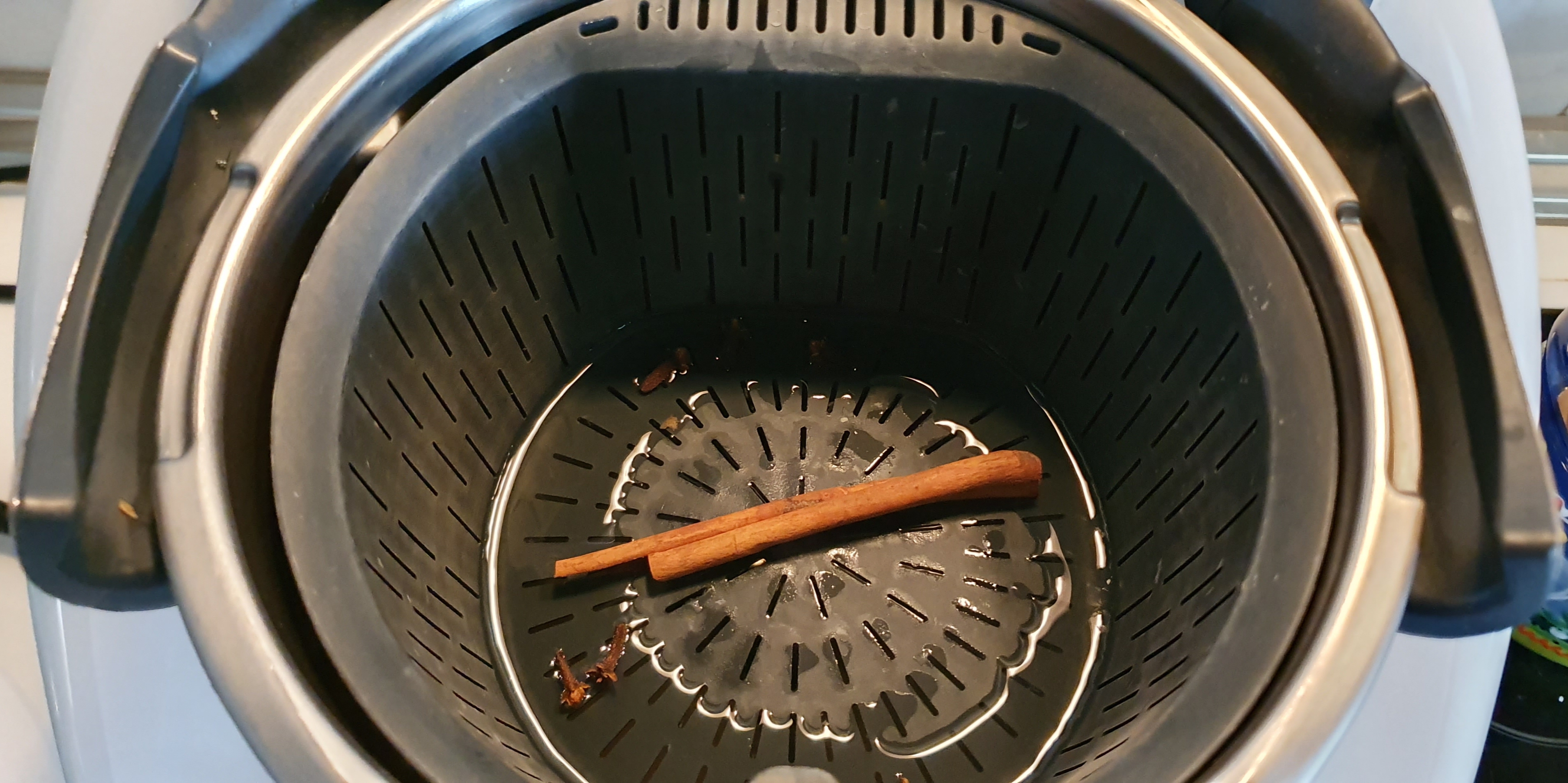 * Trancurrido el tiempo del almíbar ponga en el cestillo encima de los clavos y la canela las manzanas reservadas en el bol (si quiere al final que no se vean los clavos, cojalos del cestillo y pinchelos en el primer trozo de manzana que vaya a introducir) y programe 15 minutos/ temp varoma/vel 4