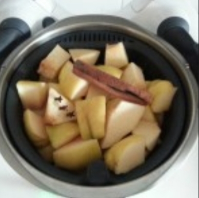 *Mientras enjuague los membríllos, trocéelos y viértalos en agua con limón para evitar la oxidación mientras corta los otros dos,introduzcalos en el cestillo encima de la canela y los clavos y programe 30 minutos temp. 100º vel 4