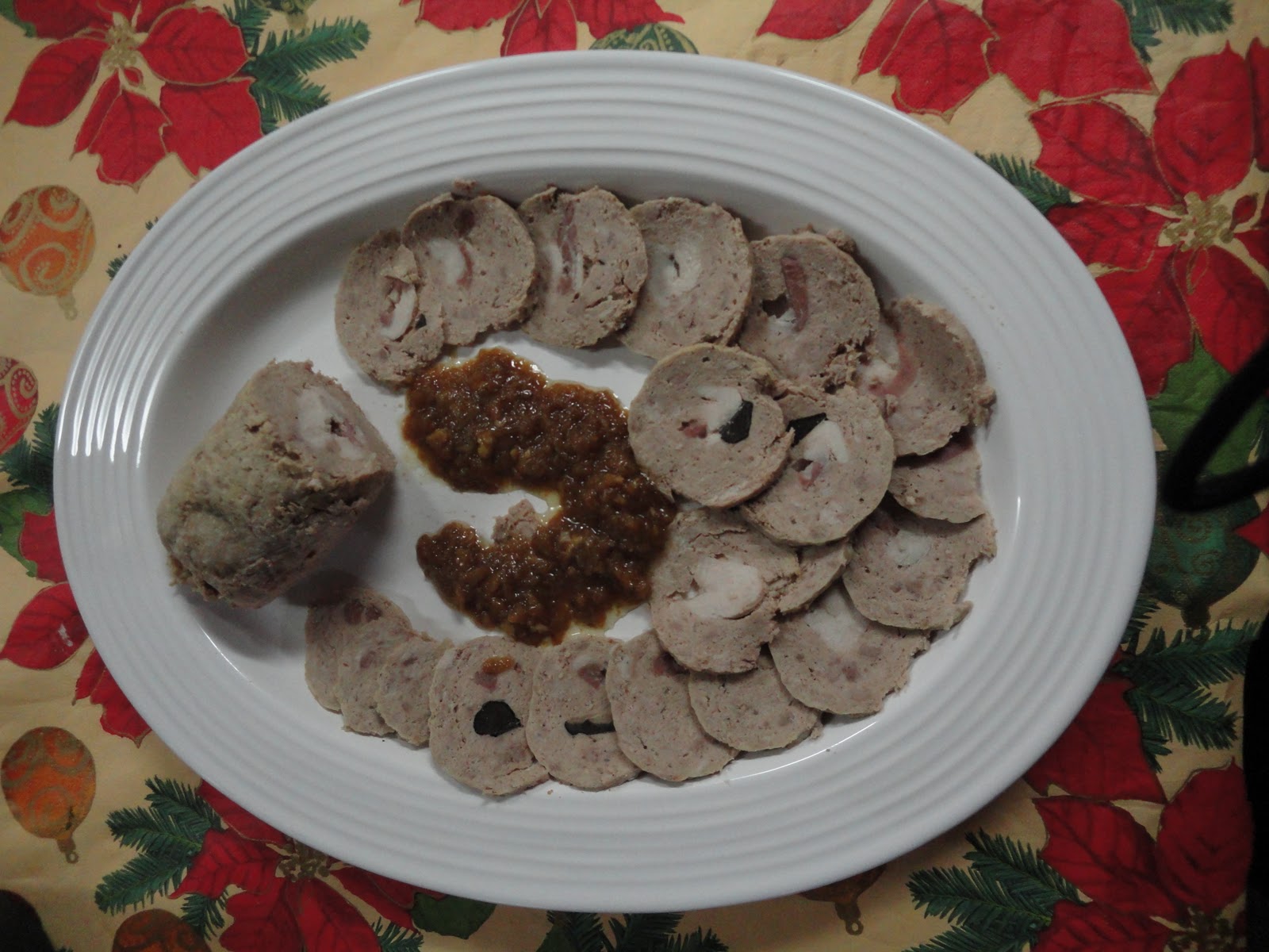 13 June 2015 INGREDIENTES:500g carne de cerdo, troceada y semicongelada250g carne de ternera, troceada y semicongelada250g pechuga de pavo (cortar y reservar varias tiras)3 huevos150g jamón serrano en dados ó en tiras100g de vino fino1/2 cubilete de pan rallado1 latita de trufassal y pimienta al gusto3 quesitos en porciones(opcional)PREPARACIÓN:Reservar las tiras de jamon y de pavoPicar las carnes de una en una e ir reservandolas en un bolSin enjuagar el vaso, añadir los huevos,el vino, el pan rallado, la trufa, la pimienta, la sal y los quesos (si los pone) y mezclar 10 seg. vel.5.Introducir en el vaso, las carnes reservadas y mezclarlas en vel.3, ayudandose con la espatula si fuese necesario.Extender la mezcla sobre un cuadrado de film transparente(papel transparente), con la ayuda de la espatula y procurando que sobre papel por los contornos.Colocar sobre la mezcla tiras alternadas de jamón y de pavo y con la ayuda del film, ir formando un rollo, procurando que quede bien prensado.Por último, envolver el rollo con papel de aluminio y colocar en el recipiente varoma.Verter 1 litro de agua en el vaso del Thermomix® y si se desea, se puede preparar un consomé: introduciendo el cestillo con una pechuga de pollo, verduras propias de un puchero(zanahoria, apio, puerro...), un trocito de culata de jamon y un hueso blanco.Programar 40 minutos, temp. varoma, vel.2.Cuando termine se le dán la vuelta a los rollos, se saca el cestillo con ayuda de la espatula, se aparta el caldo, se vuelve a meter el cestillo y volvemos a echar 1litro de agua y programamos 30 minutos temp. varoma vel. 2.NOTA:Salen 2 rollos.