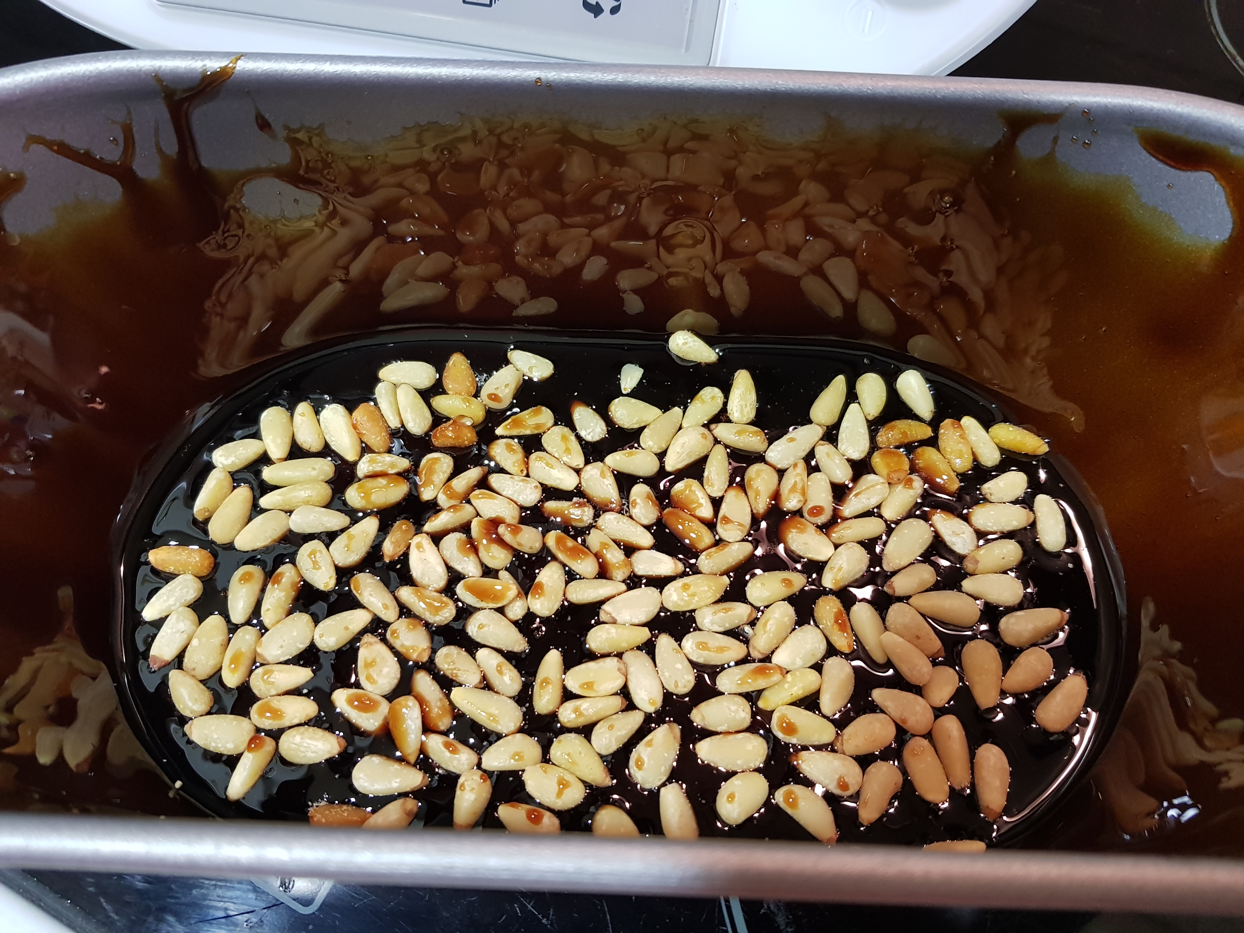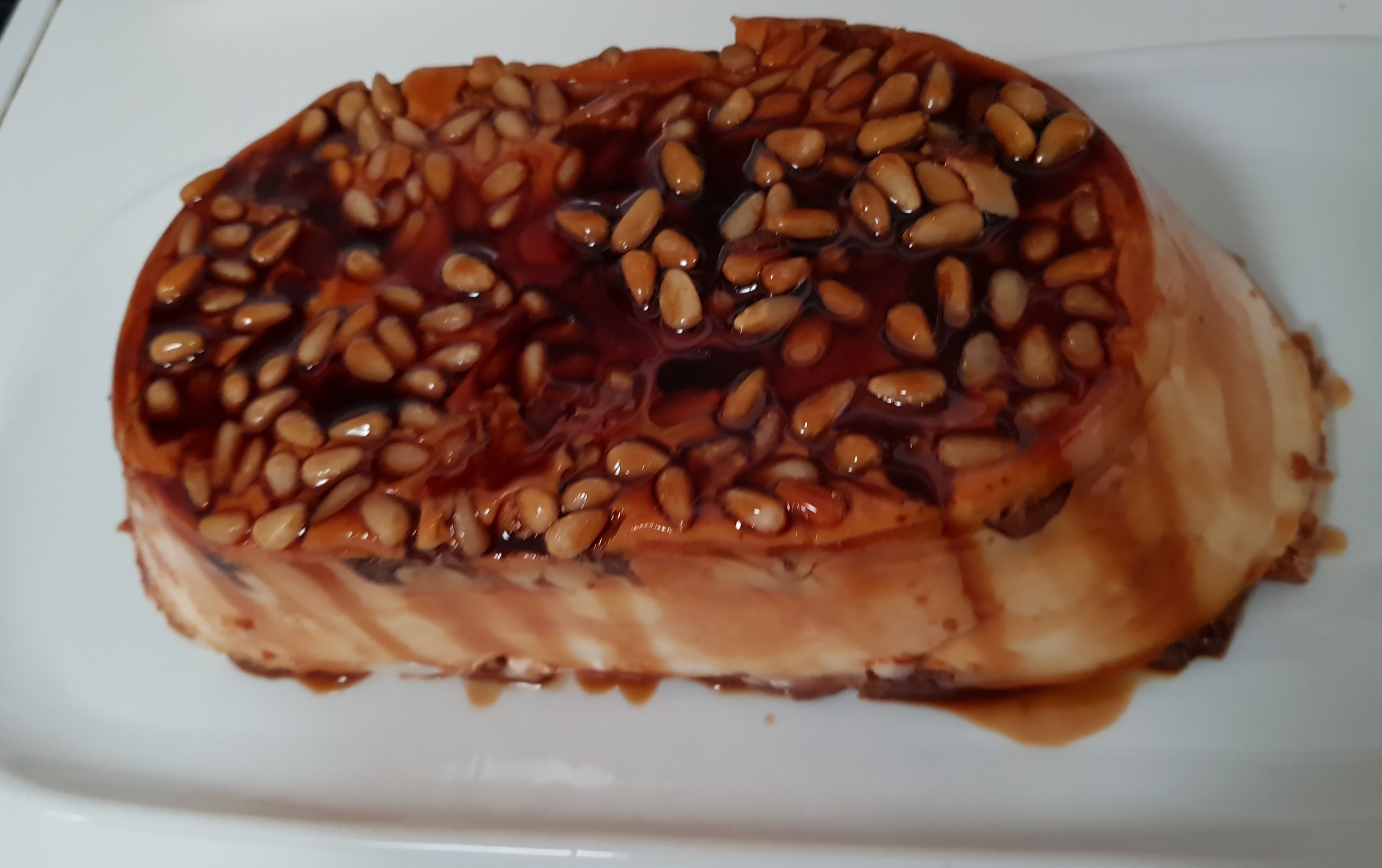 * Mientras tanto ponga en el molde o moldes el caramelo líquido y con la ayuda de un pincel repartalo por la base y paredes del molde y añada los piñones.