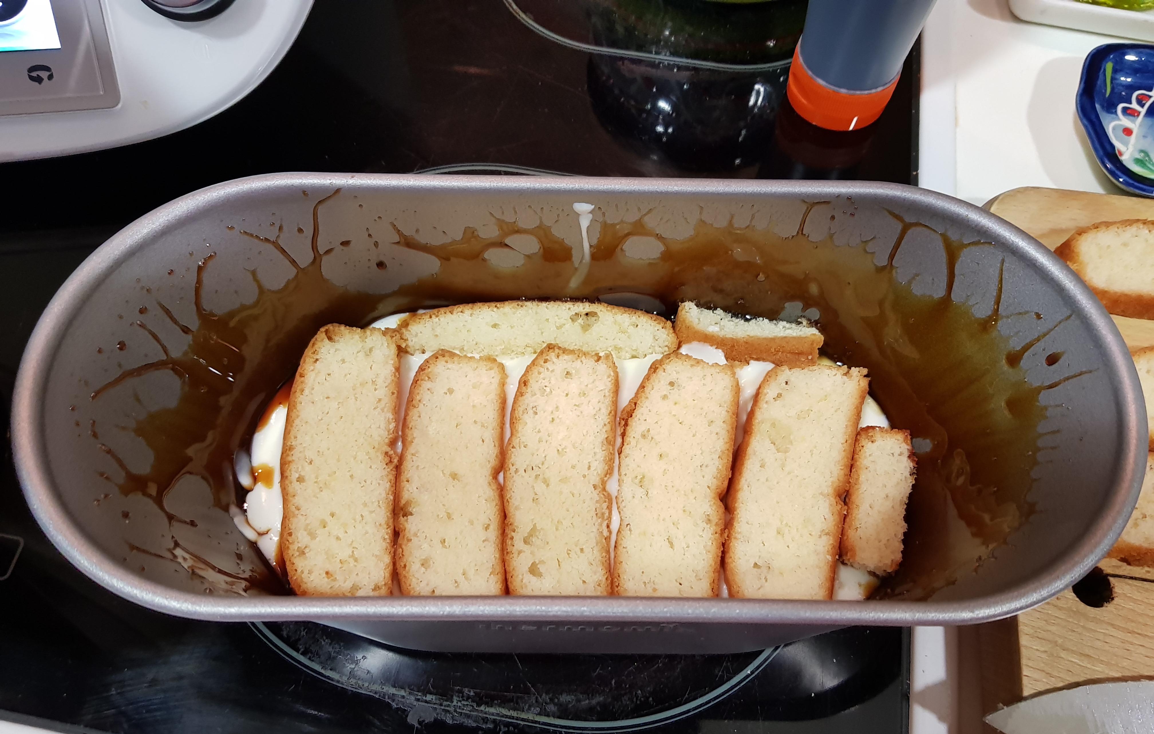* Una vez terminado el tiempo programado añada el contenido del vaso en el molde dejándolo caer encima de una cuchara al revés para no salpicar sólo un poco que cubra los piñones, para evitar que estos naden pongan una capa de bizcochos de soletilla y presione un poco con los dedos,