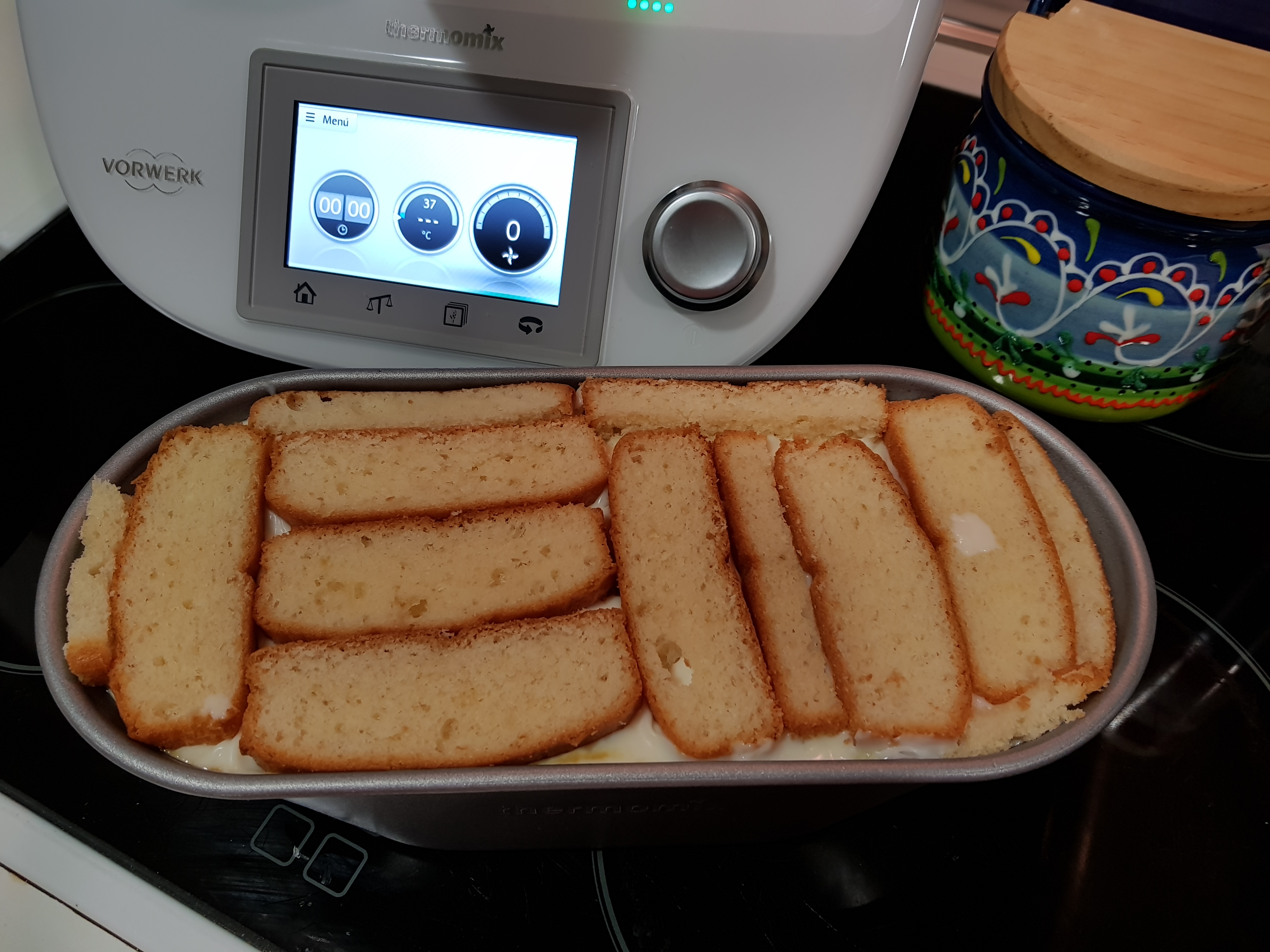 luego siga añadiendo el contenido del vaso con precaución y con la ayuda de la cuchara, una vez termine la mezcla del vaso ponga cuidadosamente los bizcochos encima, estos los podrá mojar ligeramente en leche, café, algún licor.......