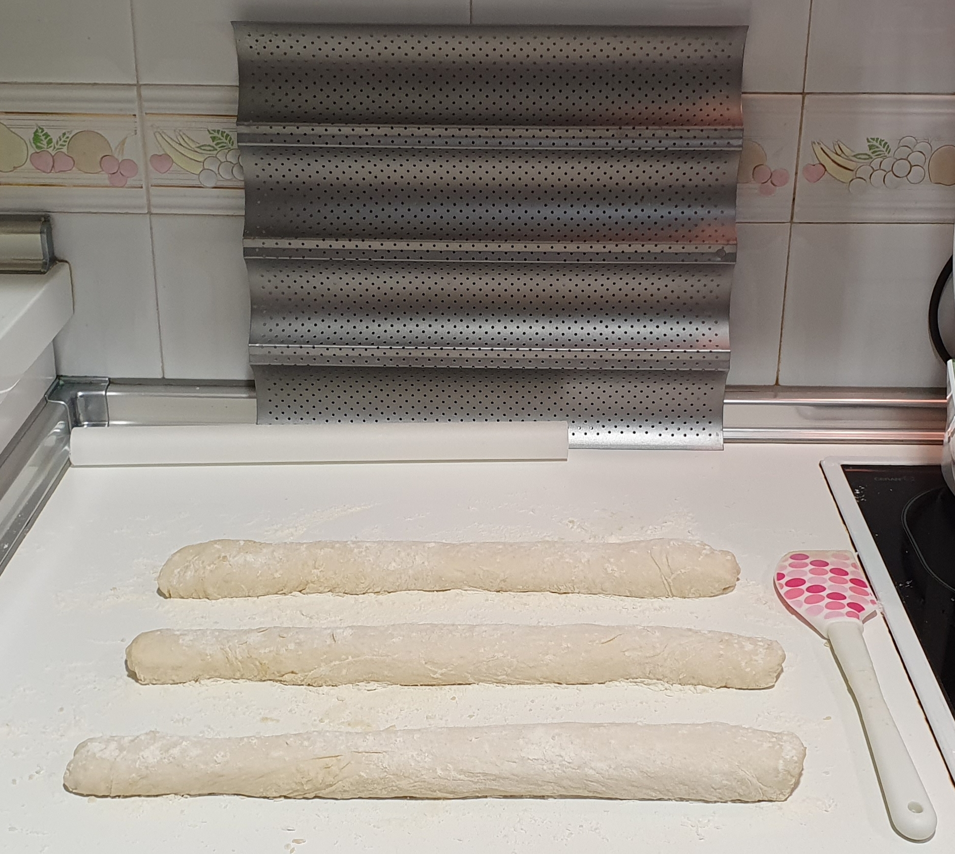 * Vuelva a aplastar suavemente cada barra y les damos forma de nuevo de baguette con cuidado para no aplastar el aire que tienen dentro.