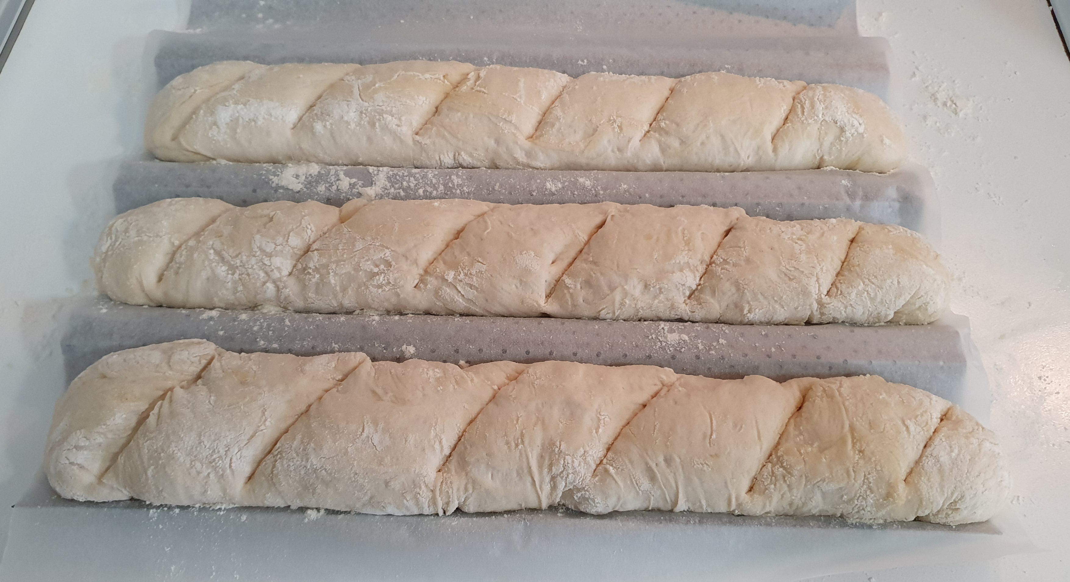 * Coloque cada baguette sobre papel de hornear, bien separadas unas de otras, formando entre ellas un pliegue con el mismo papel para que no se peguen y cuando crezcan conserven su forma