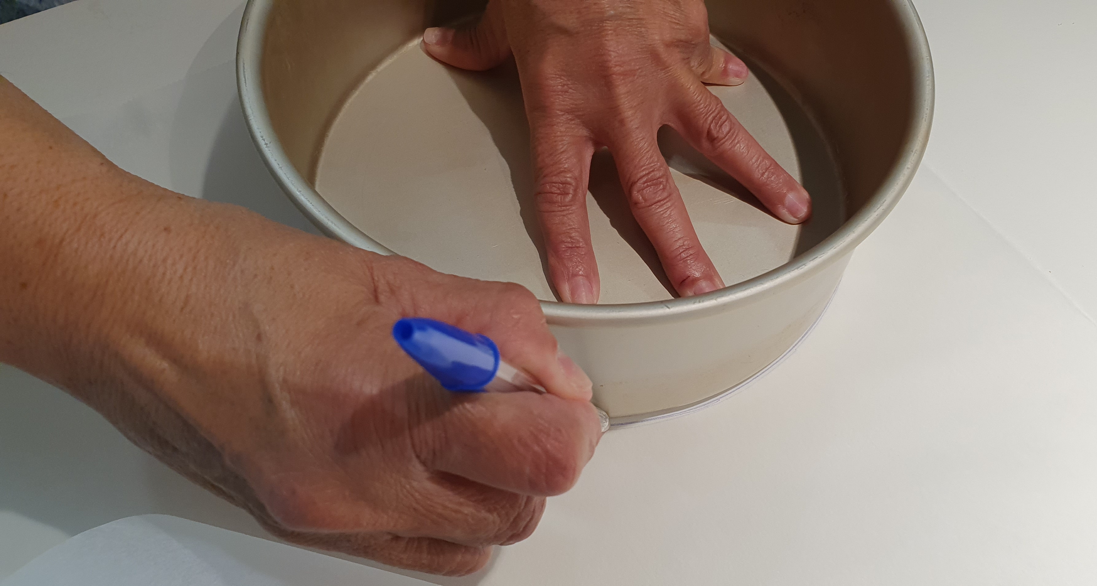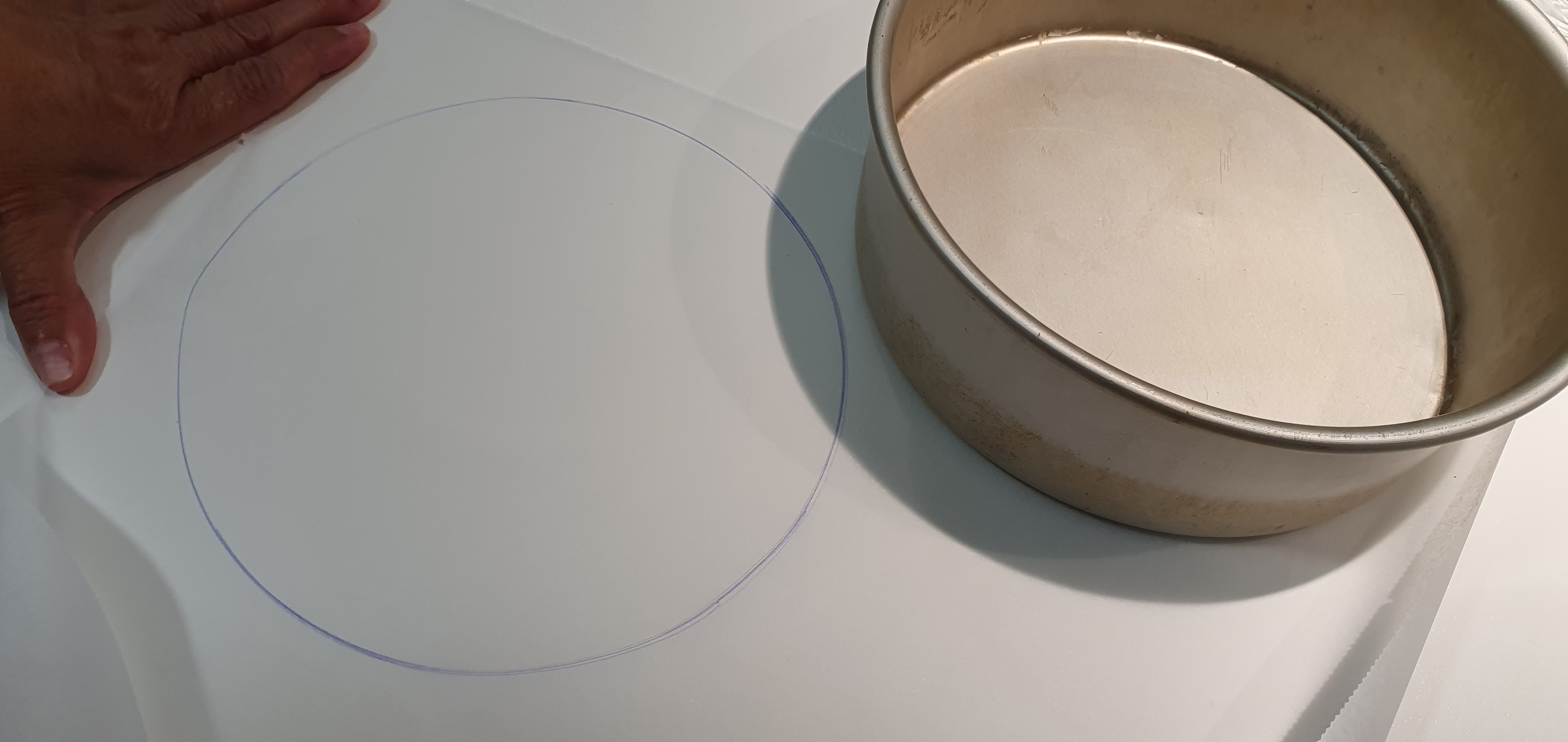 * mientras tanto forre un molde redondo de 20 o 22cm de diámetro (necesitamos que el pan crezca para arriba para poder hacer la fondue) con papel de hornear, corte un círculo como el fondo del molde en la esquinita del papel tal y como se ve en la foto, y el resto del pliego sacaré tiras del alto del molde para forrarlo por dentro, ponga en las paredes del molde por dentro un poco de mantequilla para que el papel quede bien adherido