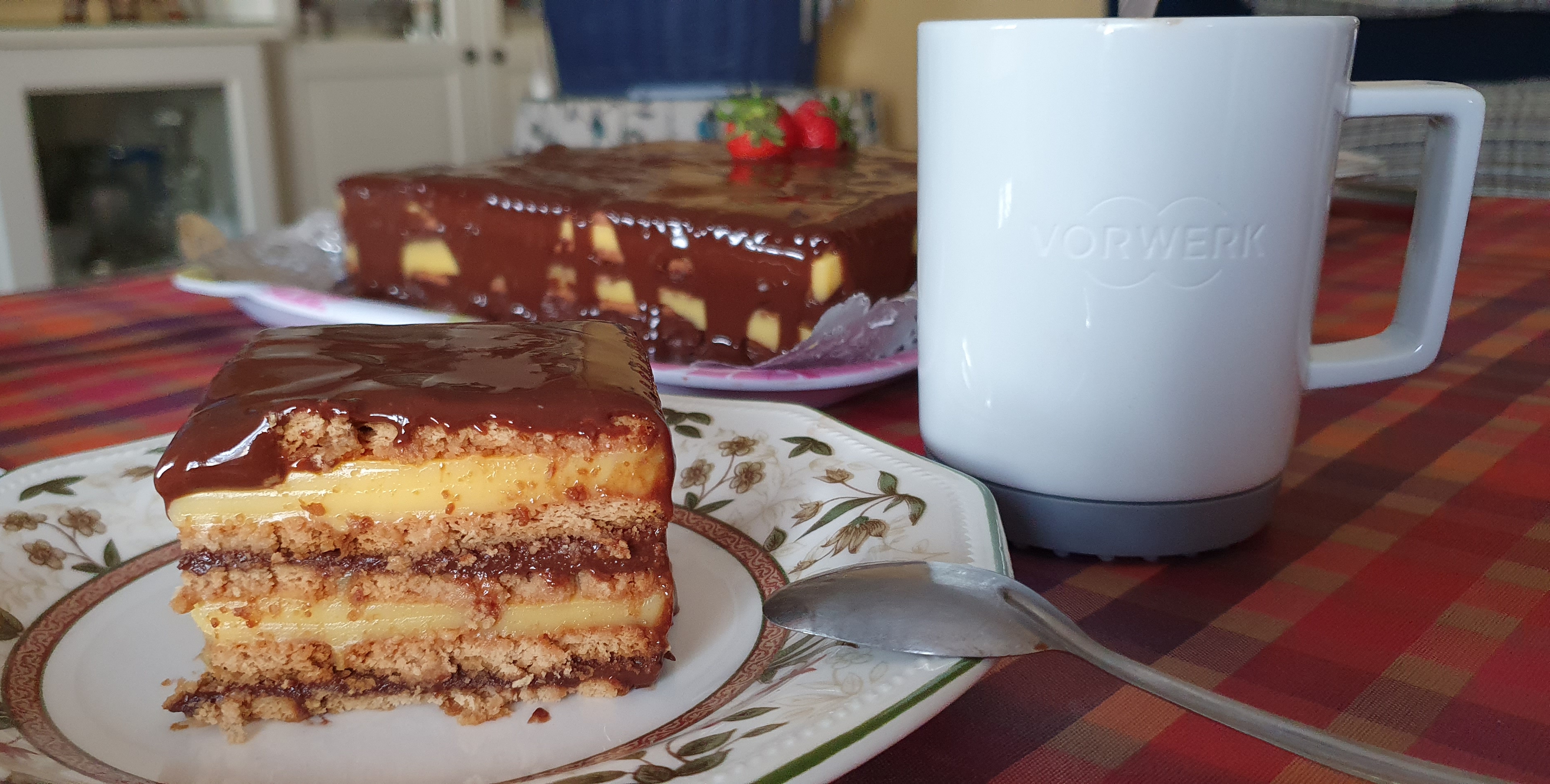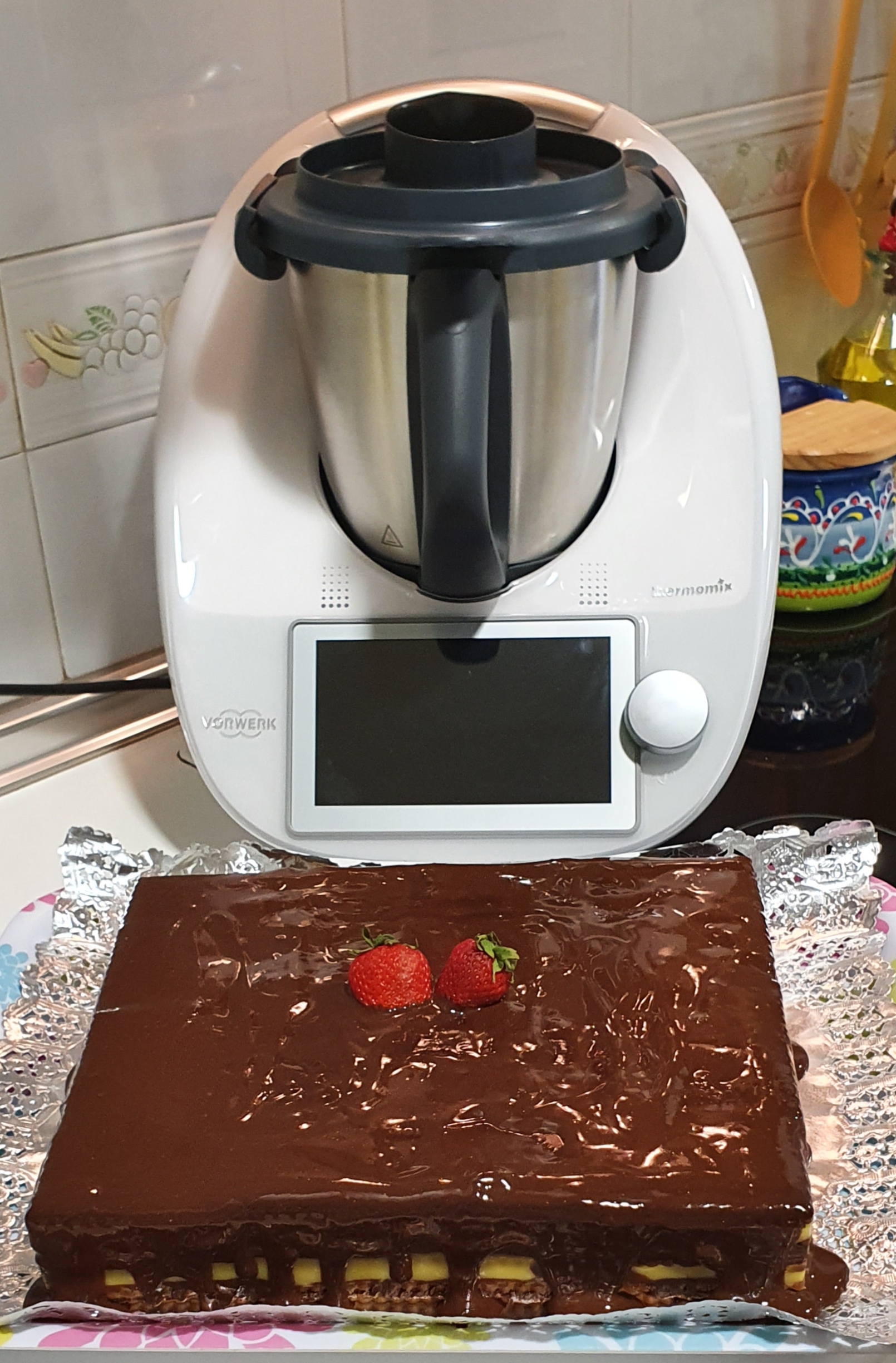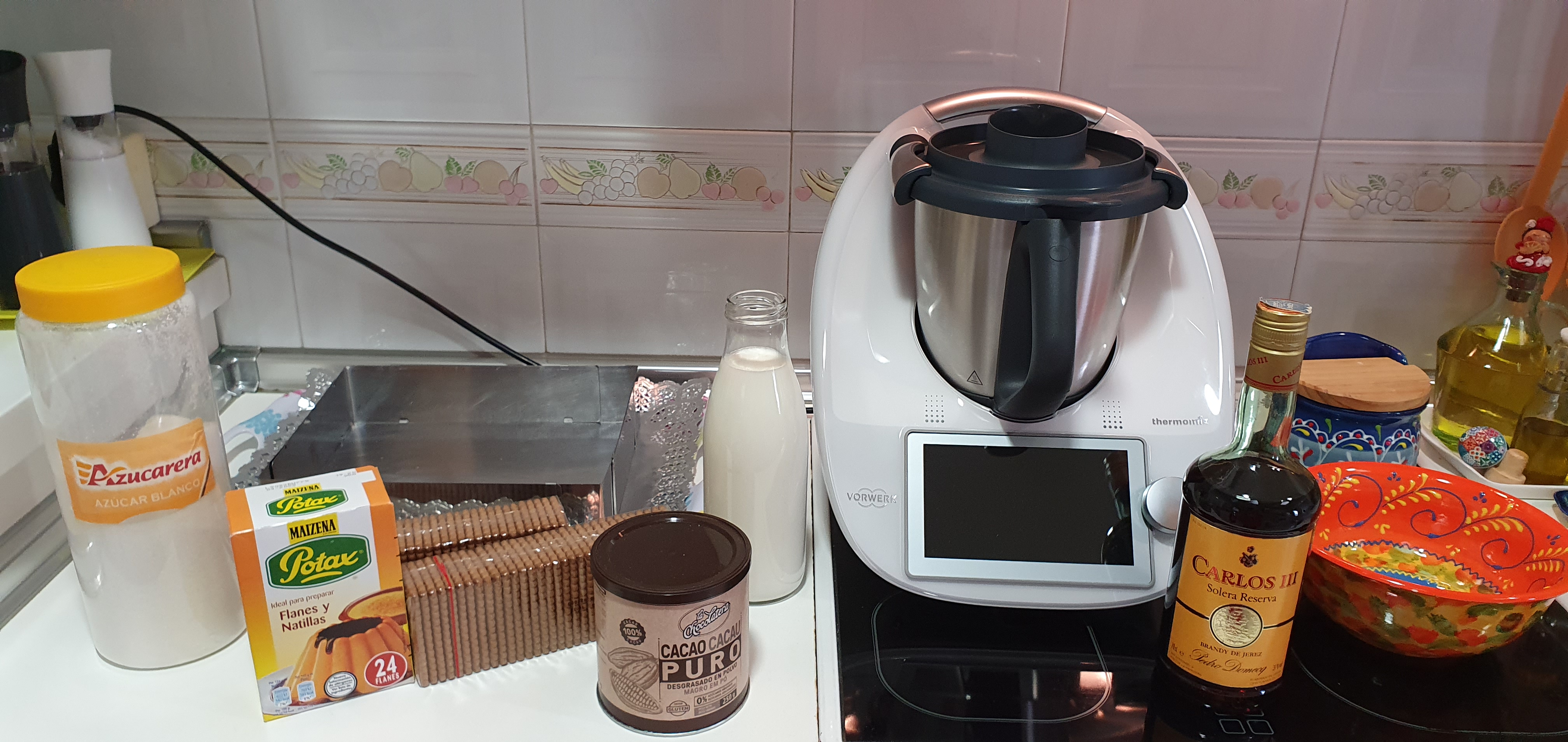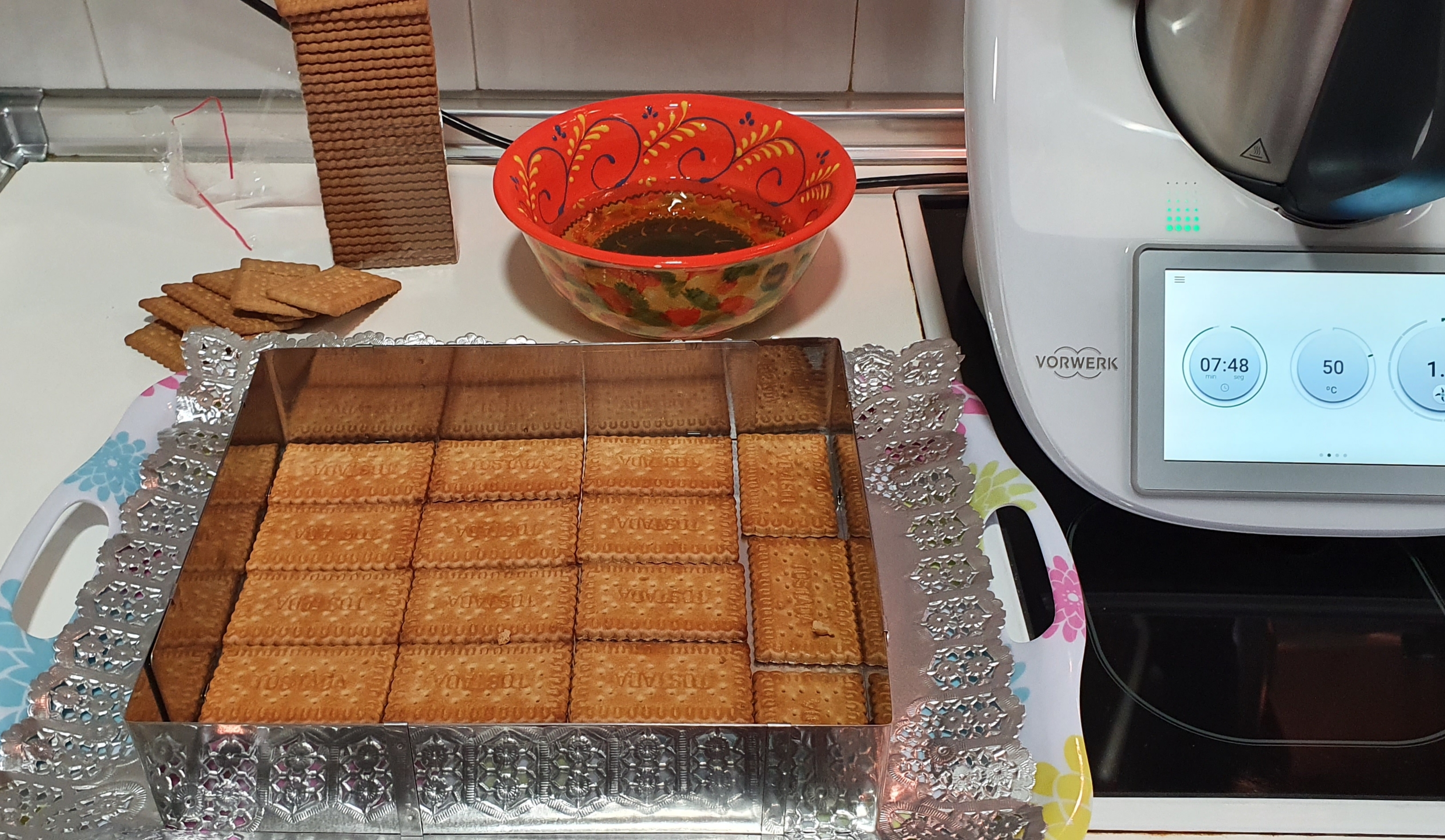 * Chocolate: sin lavar el vaso ponga el litro de leche, el cacao, tres sobres de flanes y 200g de azúcar, programe 10 mtos/ 100°/ vel 3, mientras se está haciendo ponga en el fondo del molde la primera tanda de galletas previamente mojadas en el almíbar (no empapadas o se romperan)