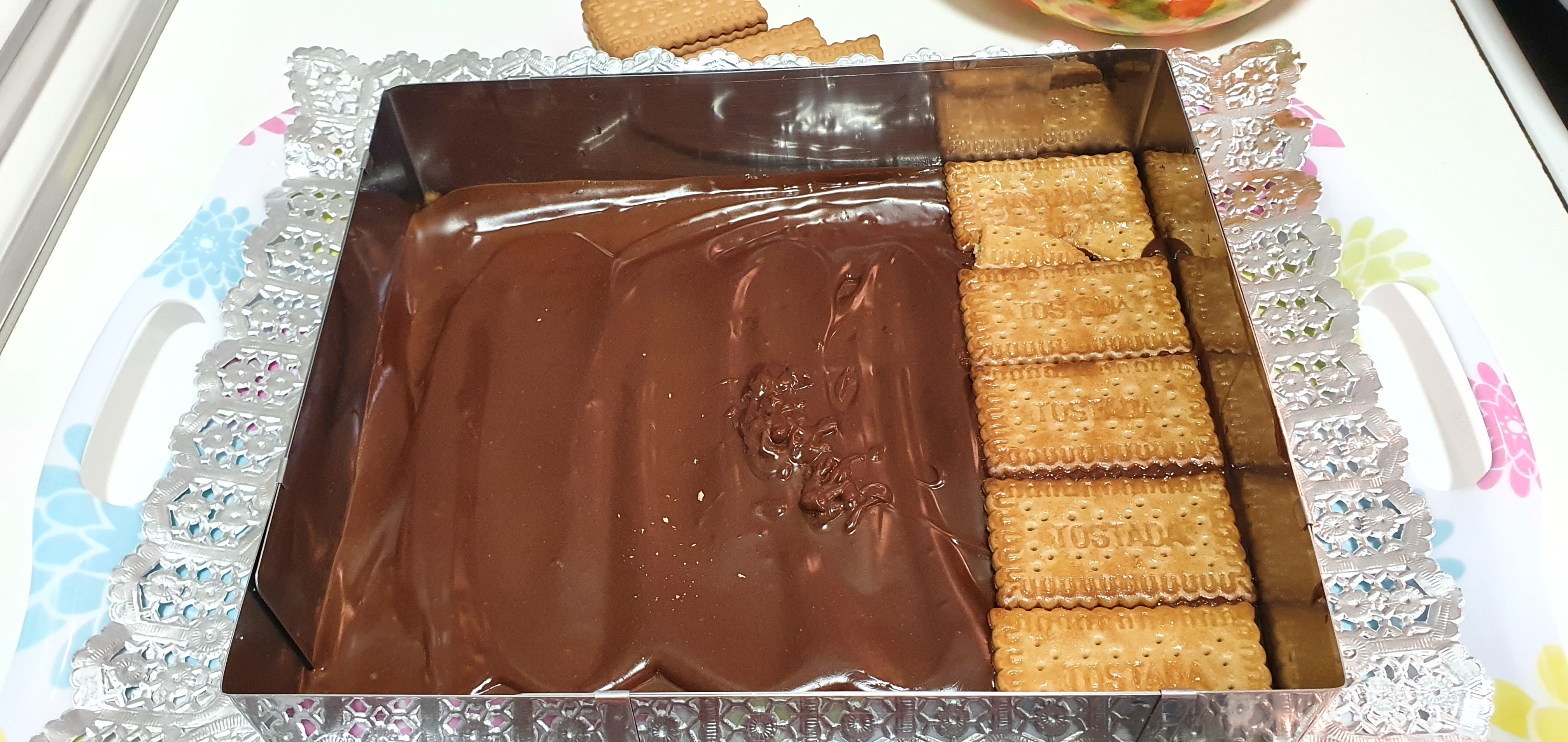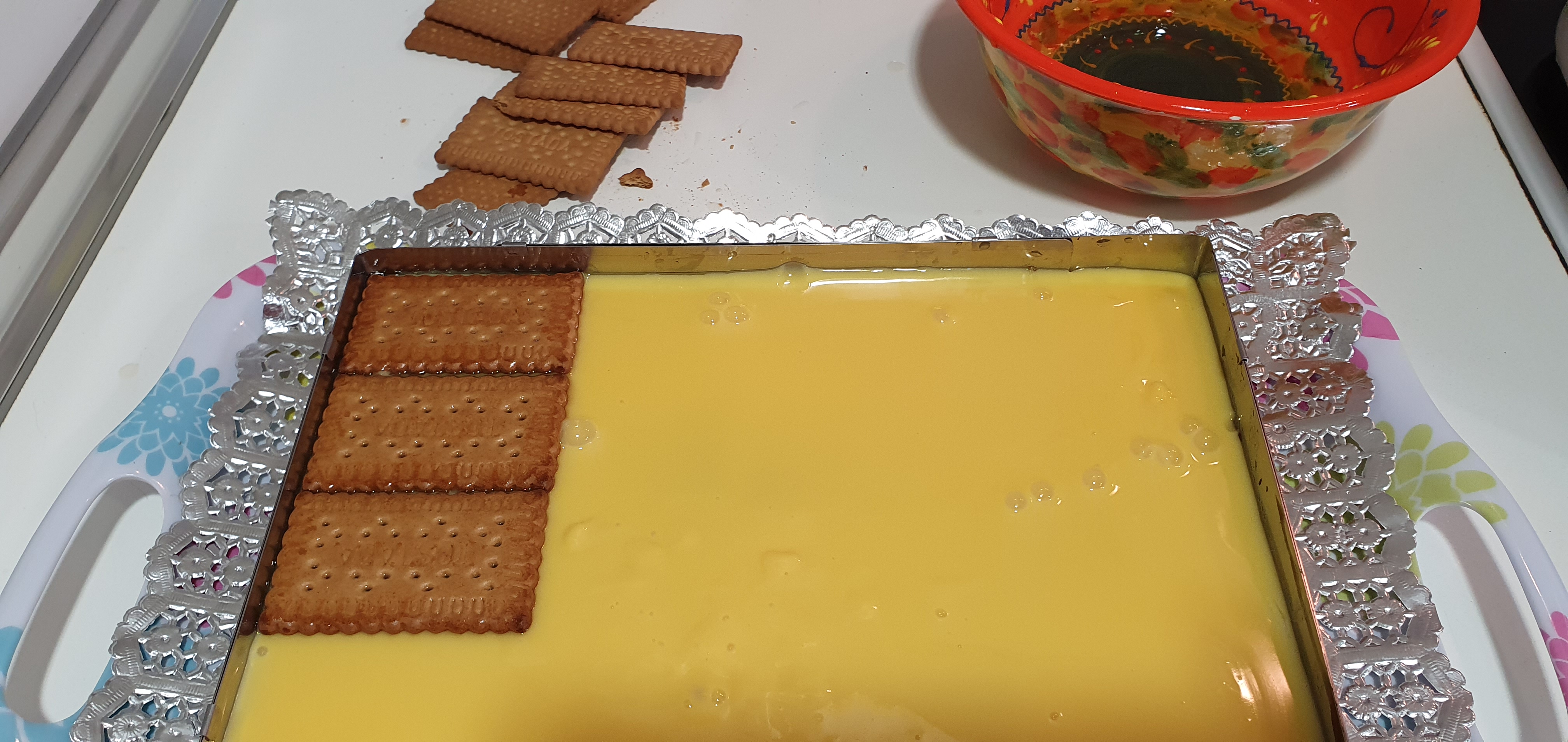 * Encima de las galletas ya mojadas en el almíbar ponga una fina capa del flan de Chocolate, siga con otra capa de galletas mojadas en almibar, otra de flan y así sucesivamente hasta terminar en galleta