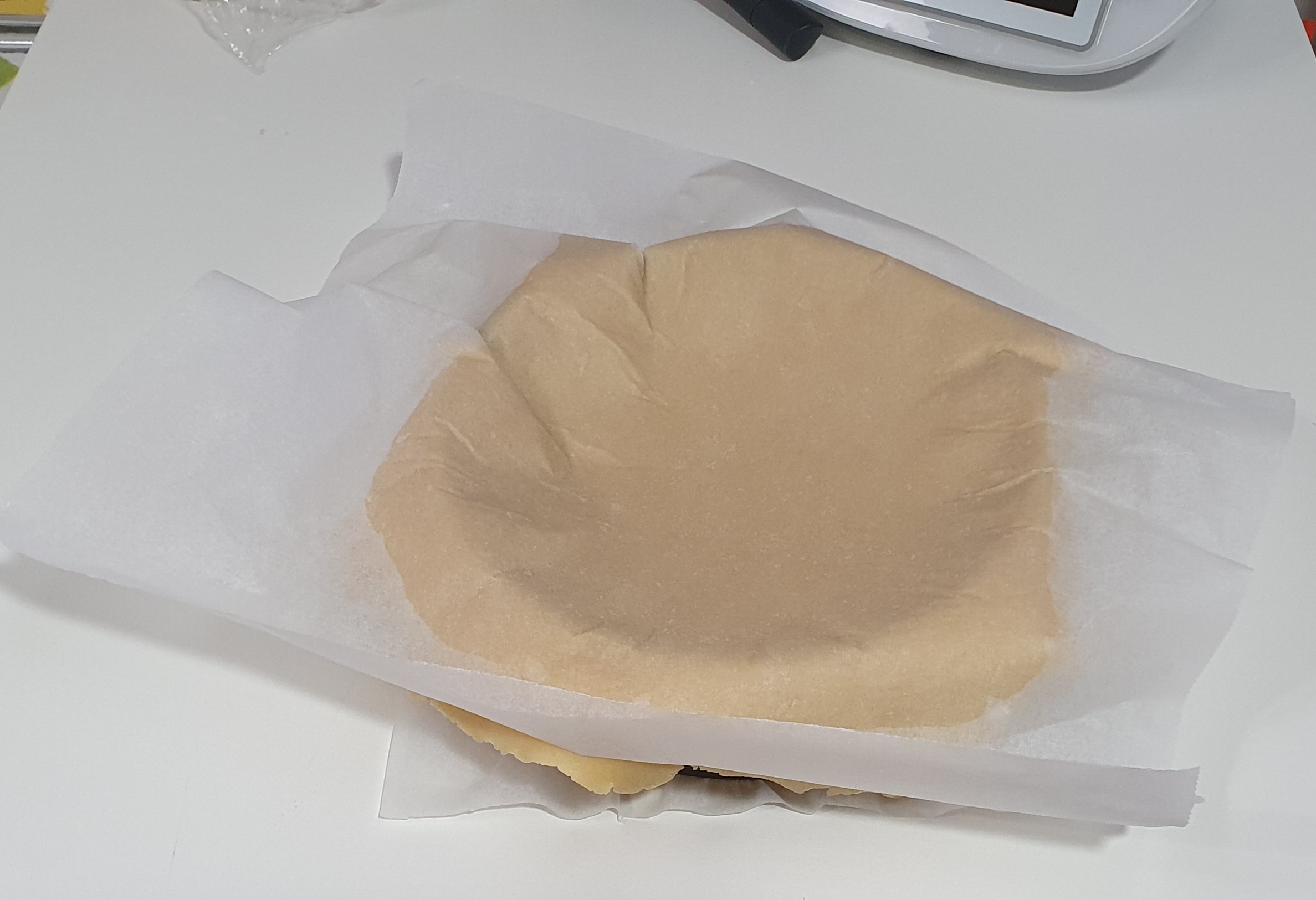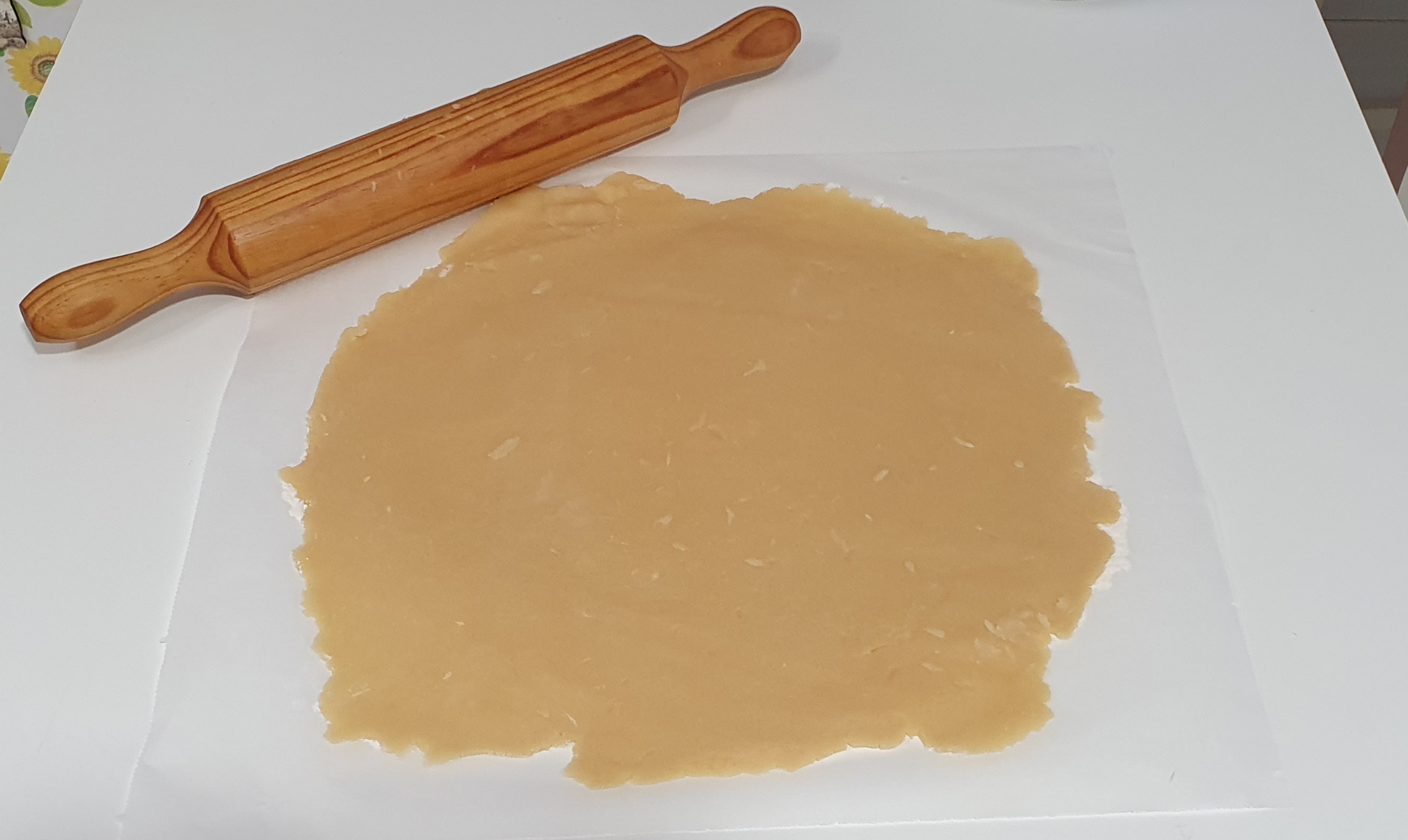 * Ponga la masa reservada de la nevera en un papel vegetal enharinado, enharine también un poco el rodillo y extienda la masa del centro hacia afuera sin sin pasar muchas veces por el mismo sitio para que la masa no se caliente y se quede pegada al rodillo