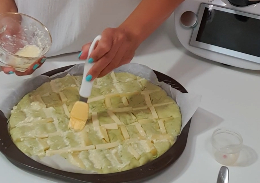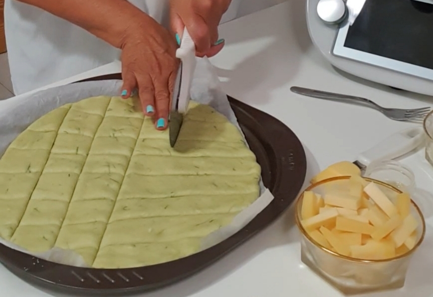 * Por último ponga en una fuente pizzera forrada con papel de hornear, dele forma redonda y plana, cortelo en tiras verticales y horizontales formando cuadrados