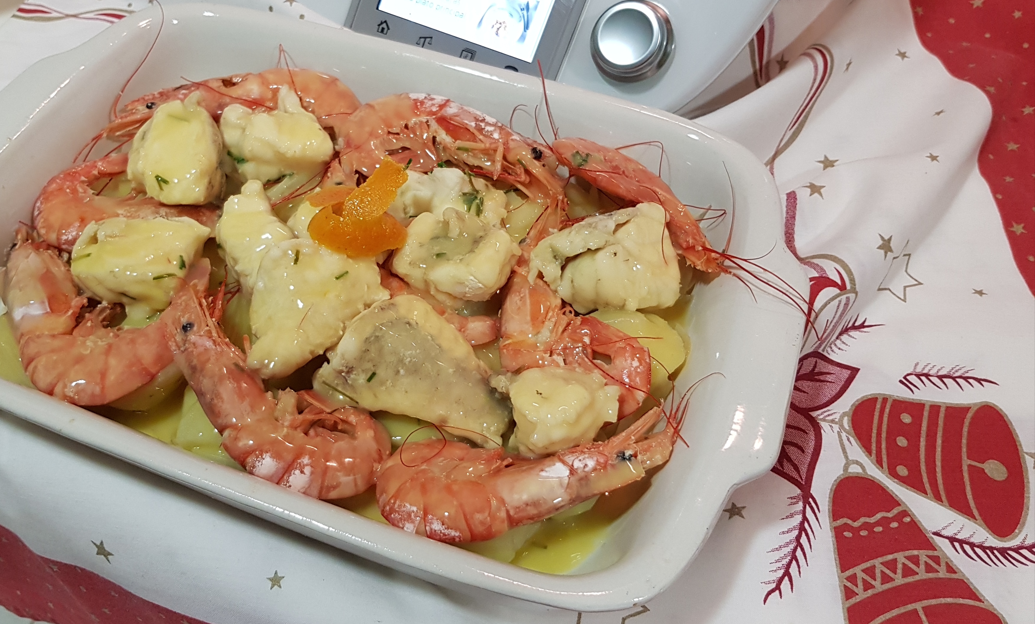 9. Retire las patatas y la cebolleta del recipiente Varoma a una fuente. Abra la bolsa, ponga en la fuente el rape y los gambones junto con las patatas (reserve la salsa en la bolsa), y espolvoree con 1 pellizco de sal. (Yo también puse a la patata un poco de pimienta molida.