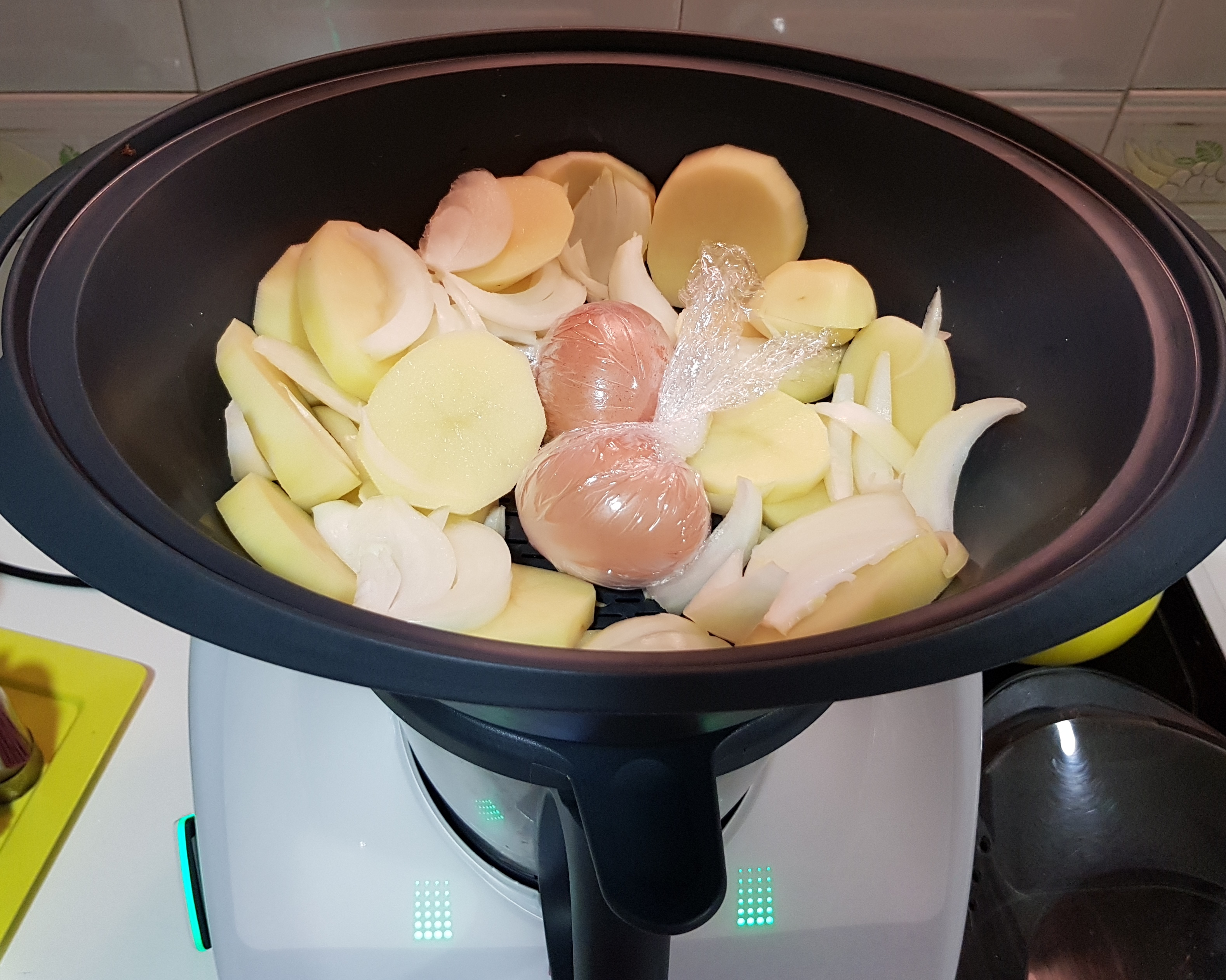 Sitúe el recipiente Varoma en su posición con las patatas y la cebolleta y mezcle bien con la espátula. Añada los huevos, tape el Varoma y programe 25 minutos, temperatura Varoma, velocidad cuchara.