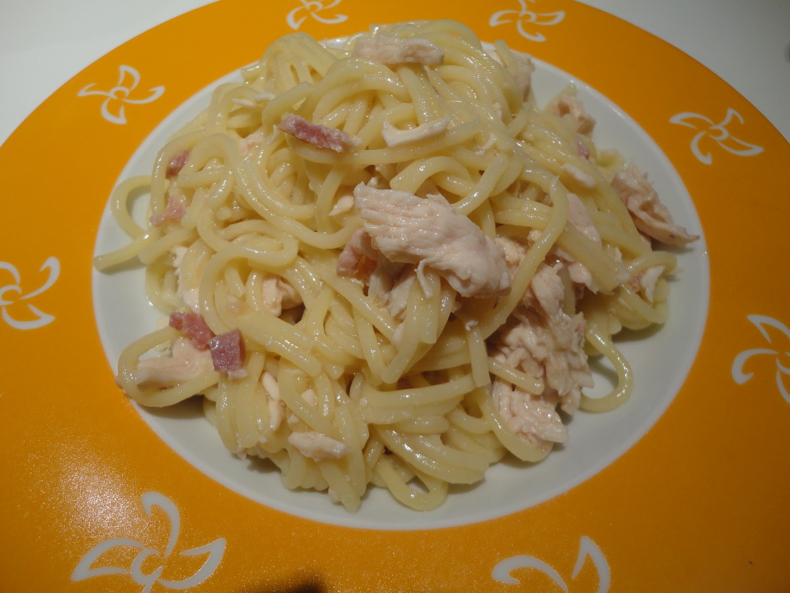 28 January 2015 INGREDIENTES:Para 6 raciones*4 dientes de ajos*1/2 guindilla- (cayena)*120g beicon en taquitos*500g pechuga de pollo cortado en tiras*800g agua*350g espaguetis*50g de aceite*1 pastilla de caldo de pollo o salPREPARACIÓN:*Troceamos los ajos y la guindilla 4 segud. vel.5*Bajar los restos de las paredes con la espatula, añadimos el aceite y freimos 5 mint.temp.varoma vel. cuchara*Luego rehogamos el beicon y el pollo, 5 mint.temp. varoma, giro a la izquierda y velocidad cuchara*Añadimos el agua y la pastilla de caldo o la sal, y calentamos 5 mint. temp.varoma, giro a la izquierda velocidad cuchara*Y por último los espaguetis que añadiremos por el vocal y programaremos el tiempo que dice la bolsa, temp. 100º giro a la izquierda velocidad cucharaNOTA: Si queda demasiado al dente, dejar reposar dentro del vasounos minutos, sin programar nada mas, para evitar que se rompan.¡¡¡¡¡¡BUENISIMOS¡¡¡¡¡¡