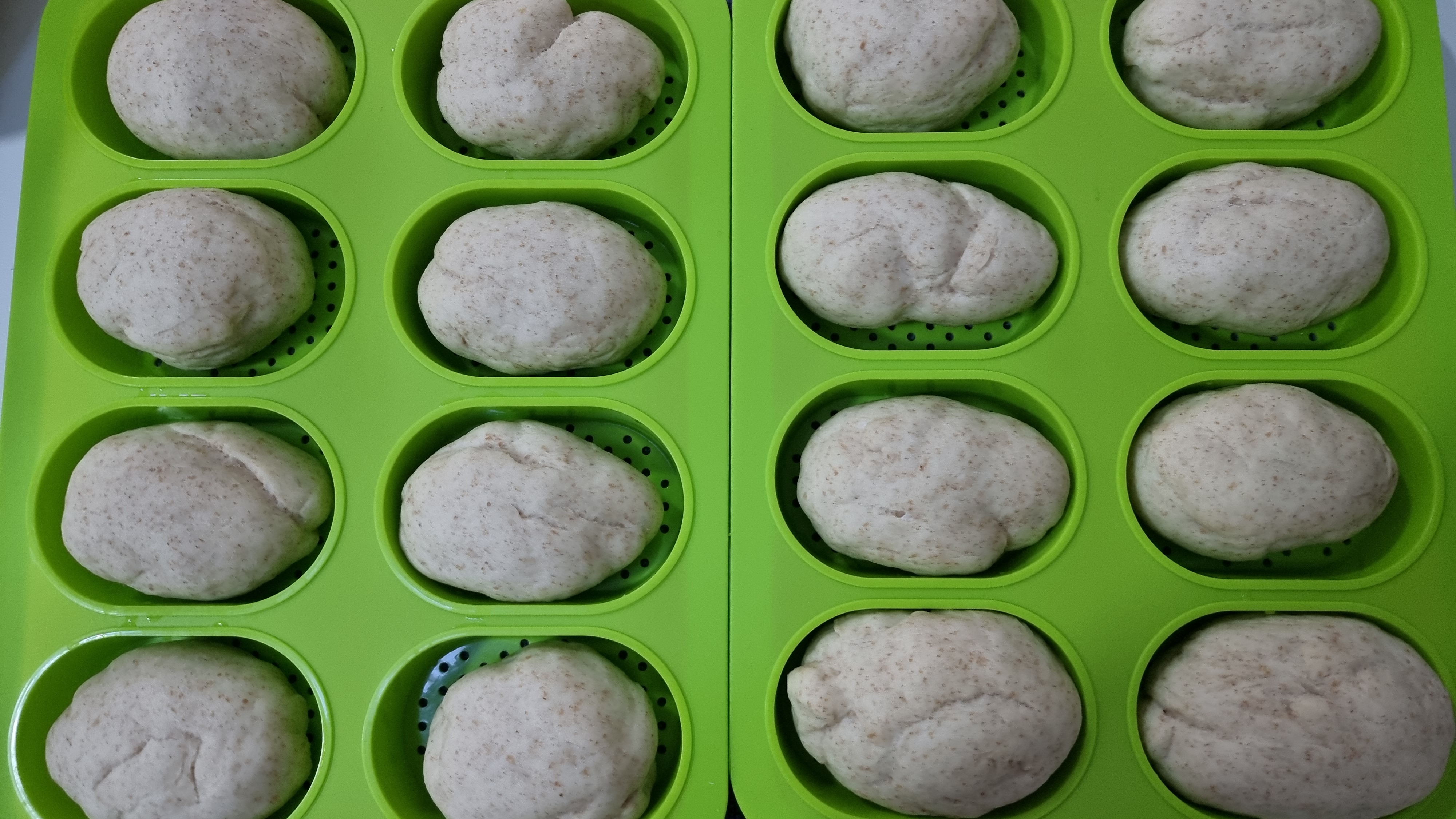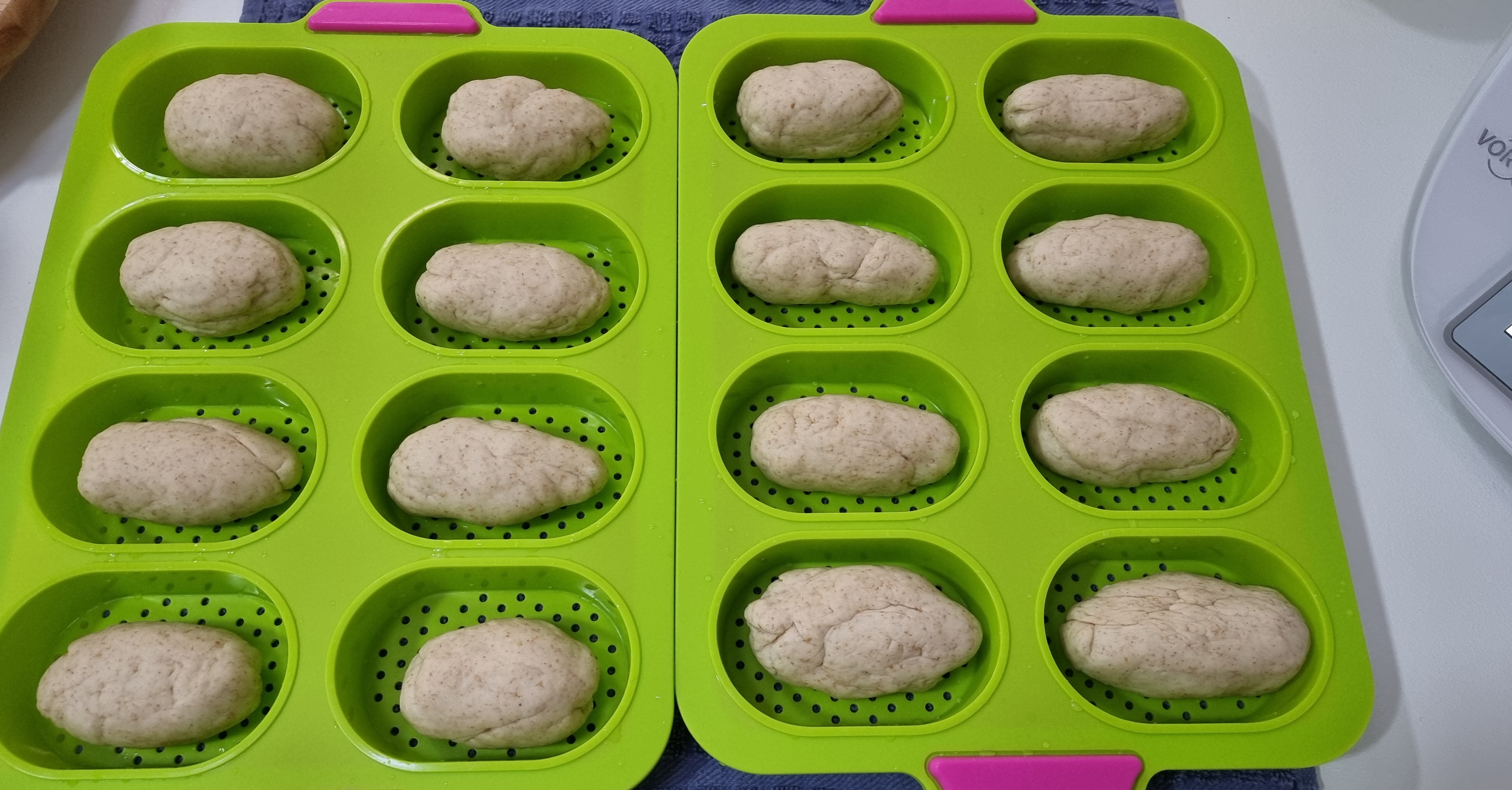 * Divida la masa en bolitas de 50 a 55g y ponga en la bandeja donde se vayan a hornear cubierta ésta con papel vegetal, separadas, por que crecen mucho, o en los moldes como en la foto y dejar reposar hasta que doblen su volumen, tapadas con un paño.