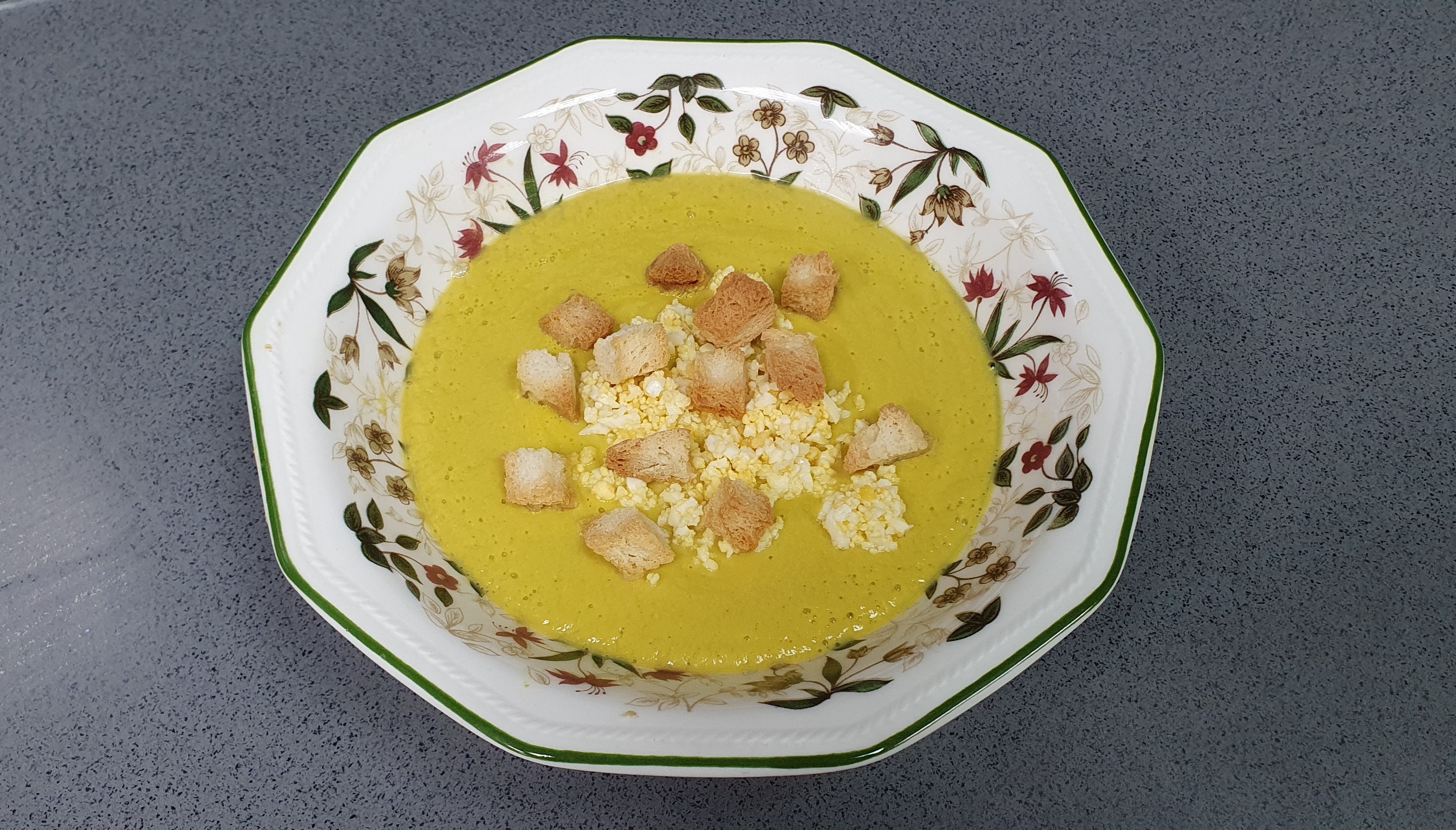 * Triture el contenido del vaso 1mtos empezando en vel5 y aumentando progresivamente hasta el 10. Sirva caliente y decore con picatostes, huevos duros troceados, taquitos de jamon, de quererlo mucho más triturado, saque la mitad de la crema a un bol y triture 2 mtos/vel 5-10 saque y reserve