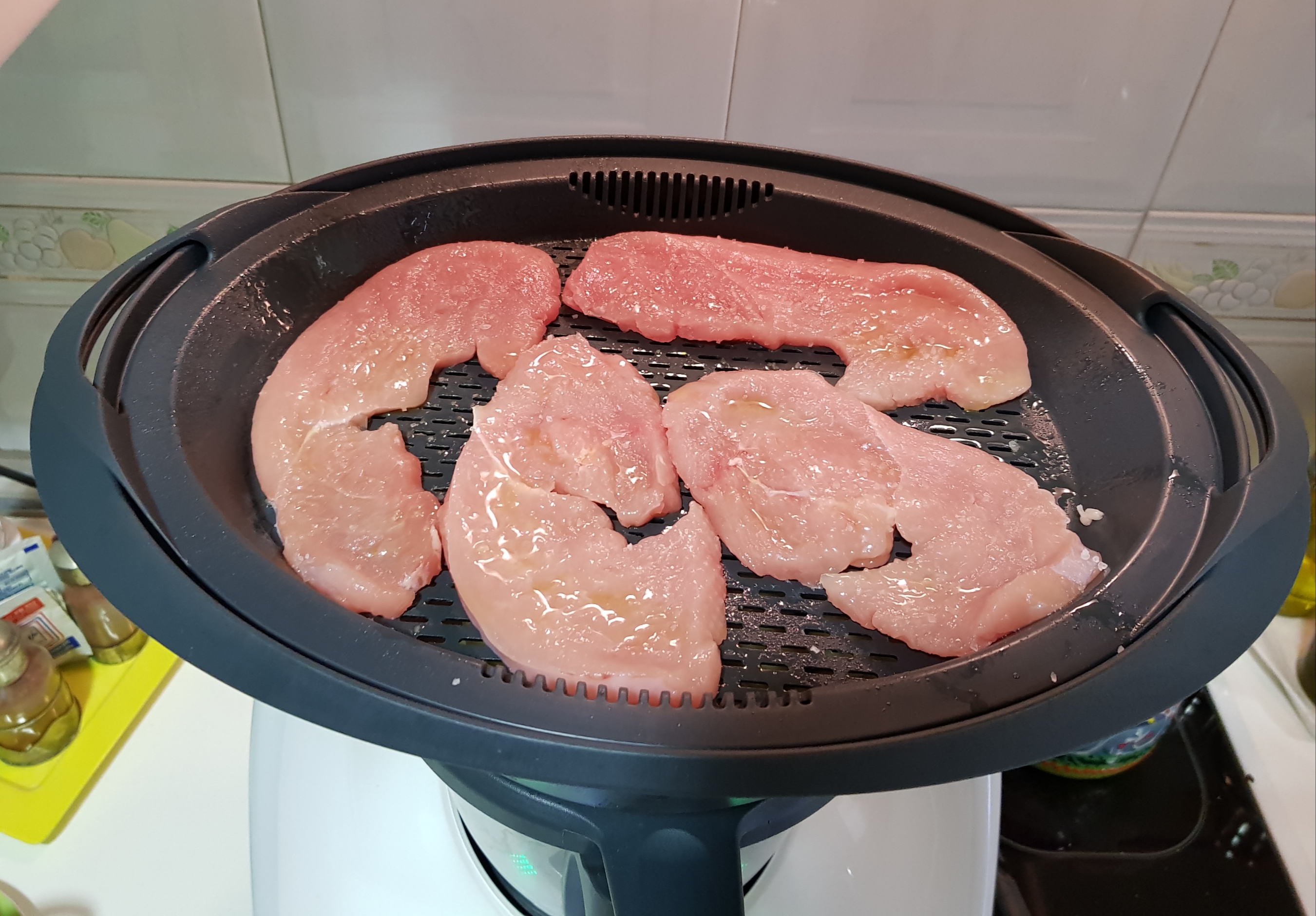 Al mismo tiempo y en la bandeja del varoma, la engrasé ligeramente y puse unos filetes de pavo para la cena, por encima de los mismos un hilito de aceite sal y pimienta al gusto, al ser de baja cocción estará en el mismo tiempo