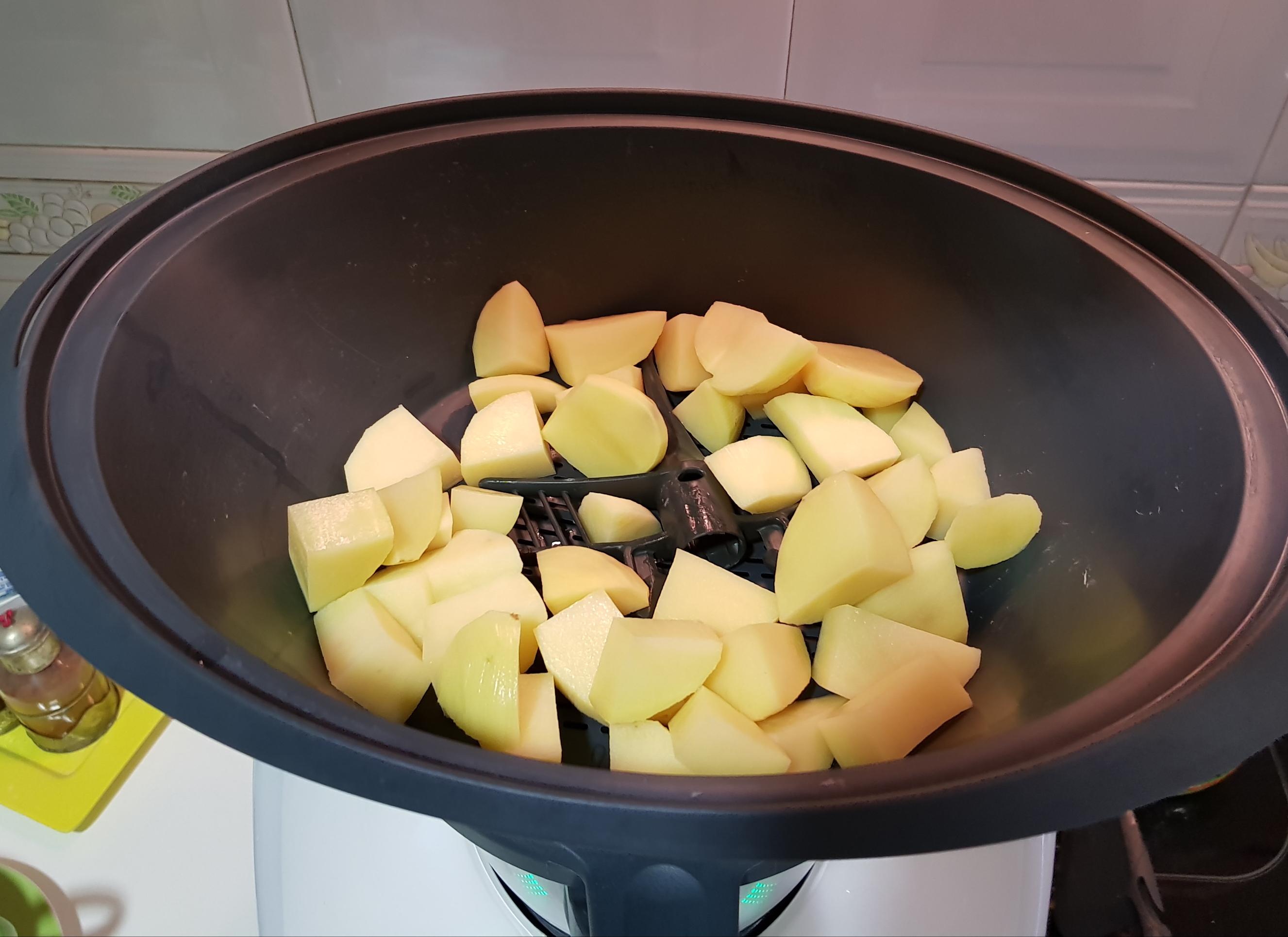 Cocinando este plato en thermomix (tacos de pavo con zanahoria baby) viendo que el tiempo de cocción que necesita son 25mtos/varoma pense poner en el recipiente varoma unas patatas en cuadritos para posteriormente aliñarlas, con el truco de poner la mariposa debajo de las patatas para crear una camara y evitar que se taponen todas las entradas de vapor