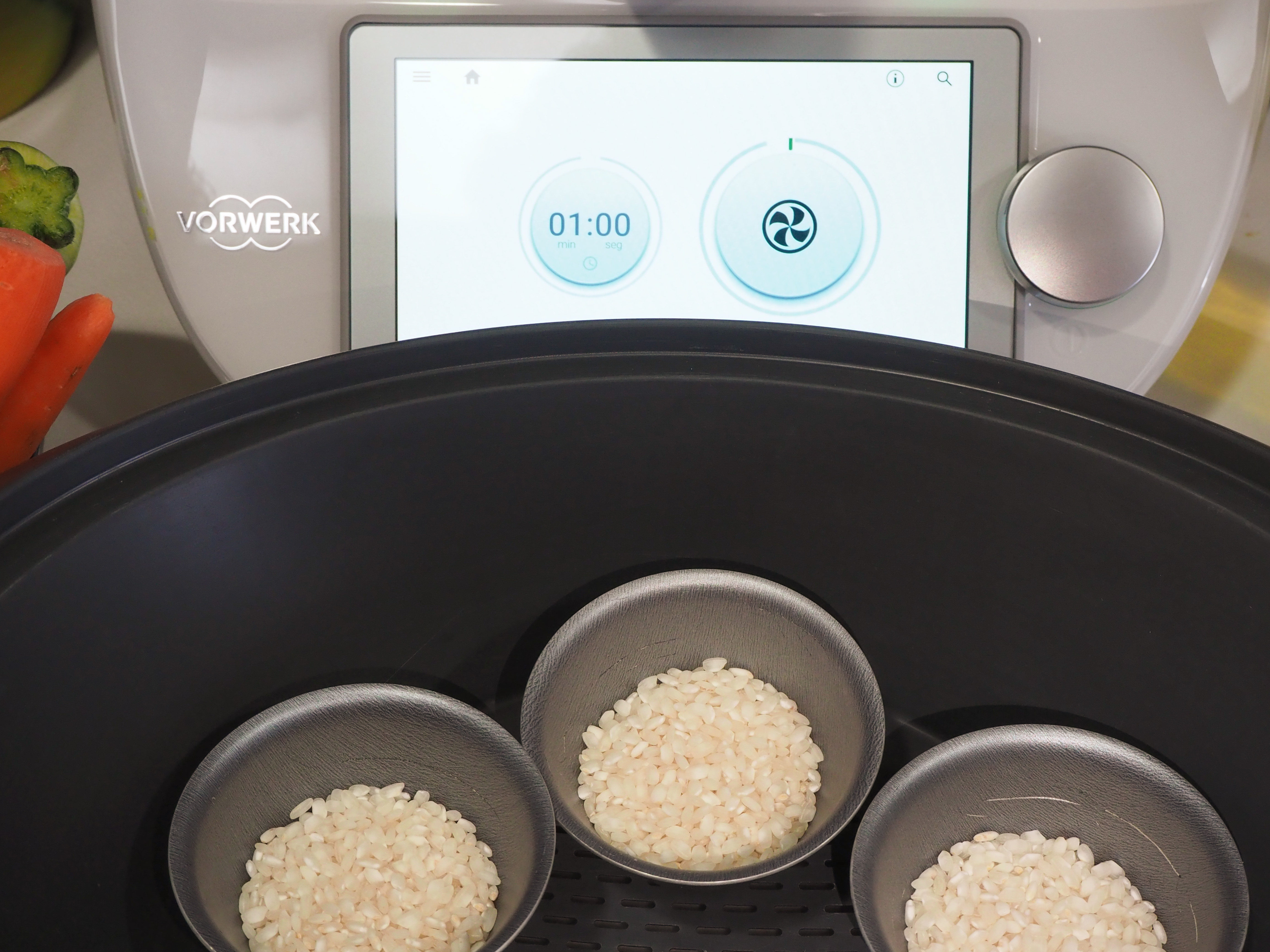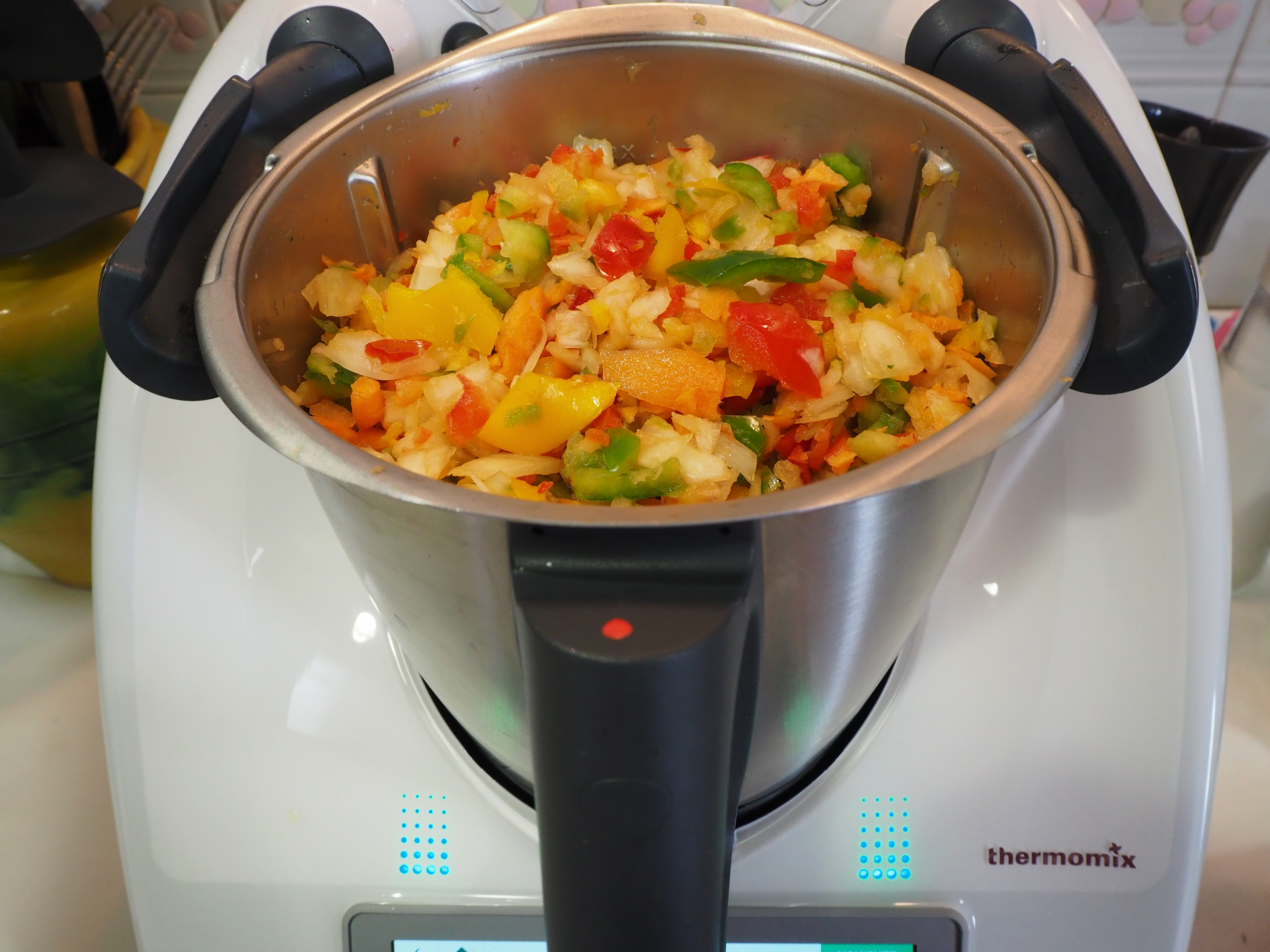 y cuando el pisto le quede de 5 a 7 minutos, abrimos la tapa del varoma, con cuidado de no quemarnos, colocamos la bandeja y lo volvemos a tapar.