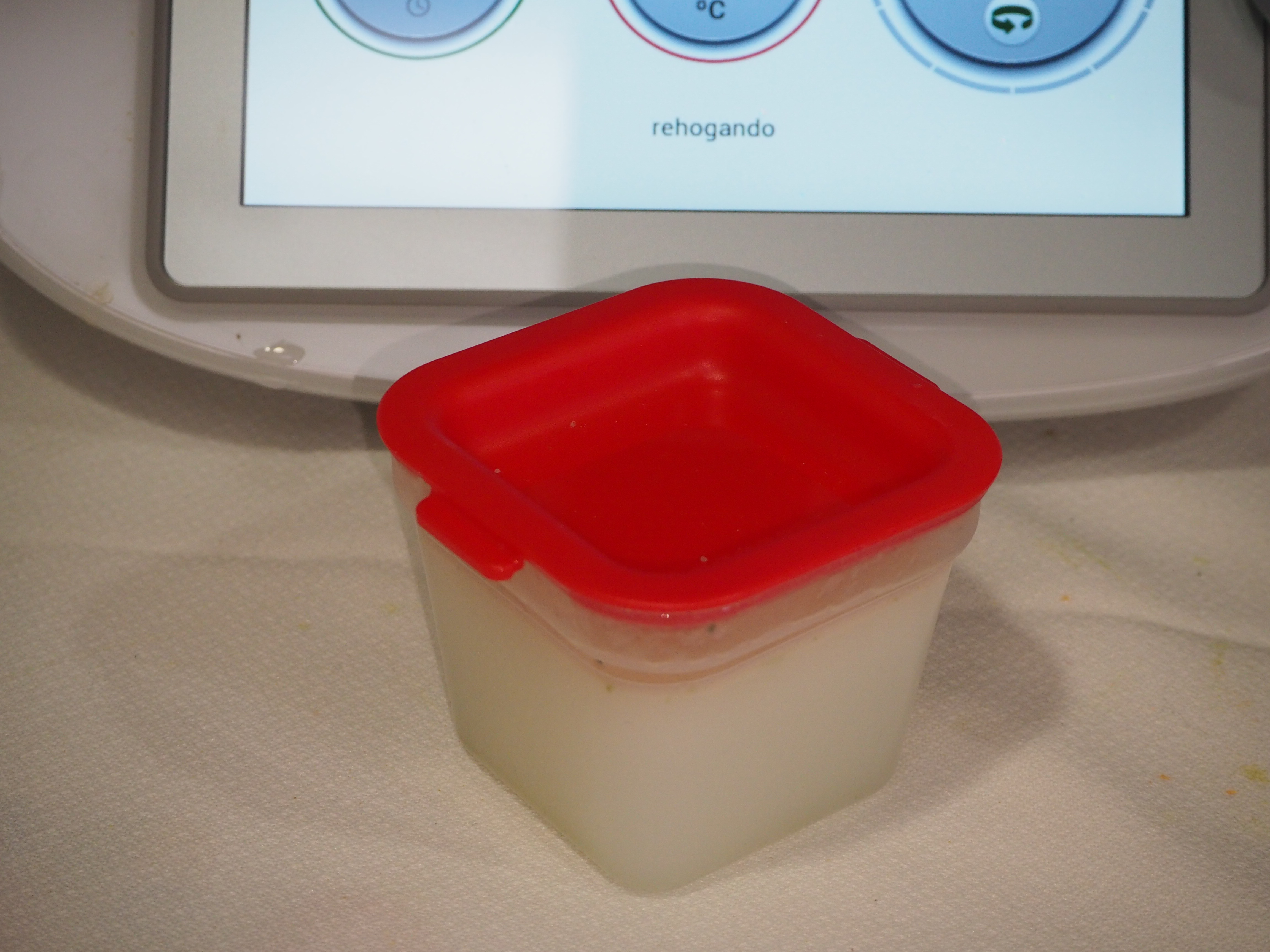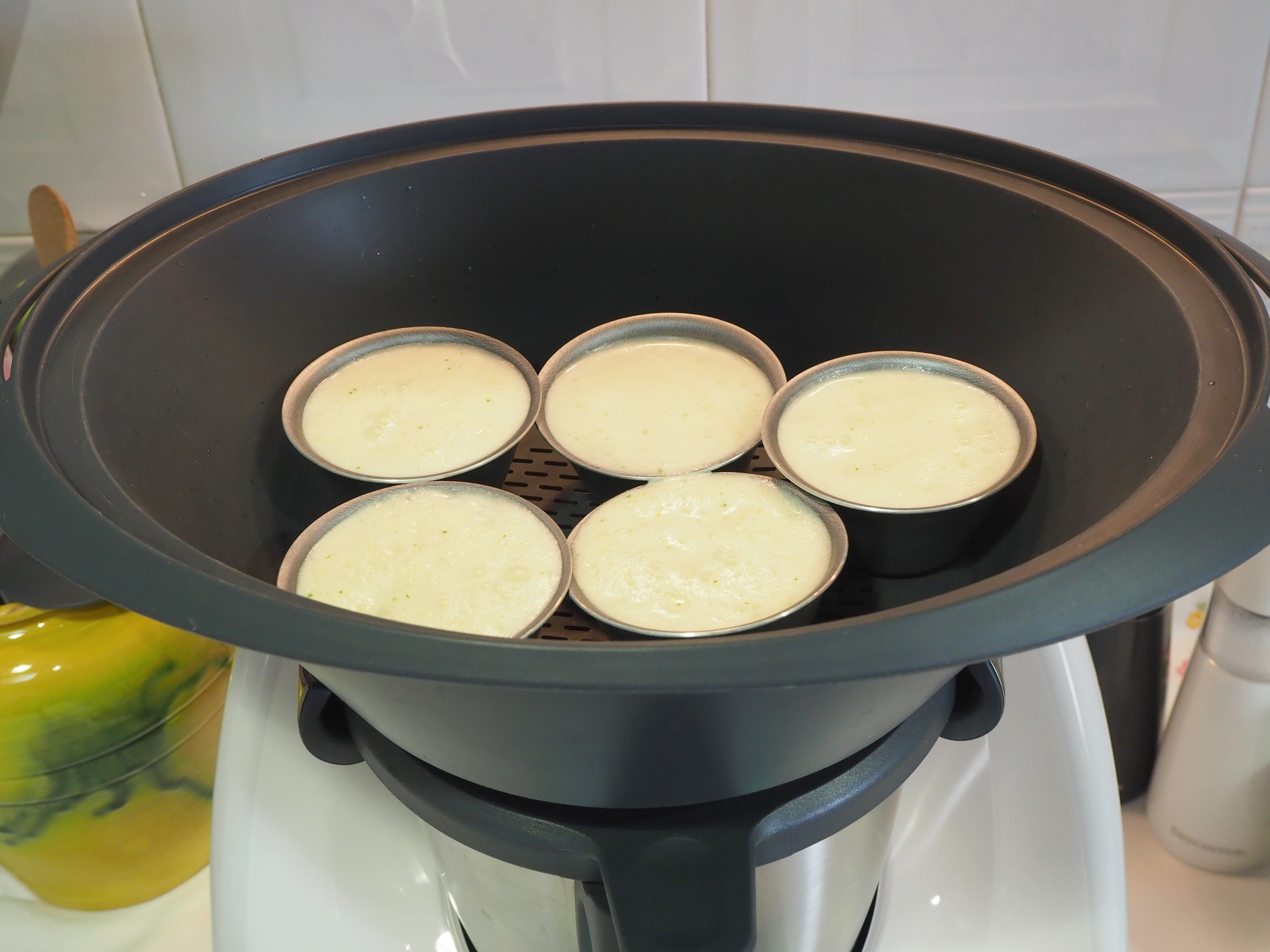 * Una vez preparadas las flaneras colocamos en el varoma y éste encima del vaso en el cual podemos estar haciendo un pisto o un tomate frito