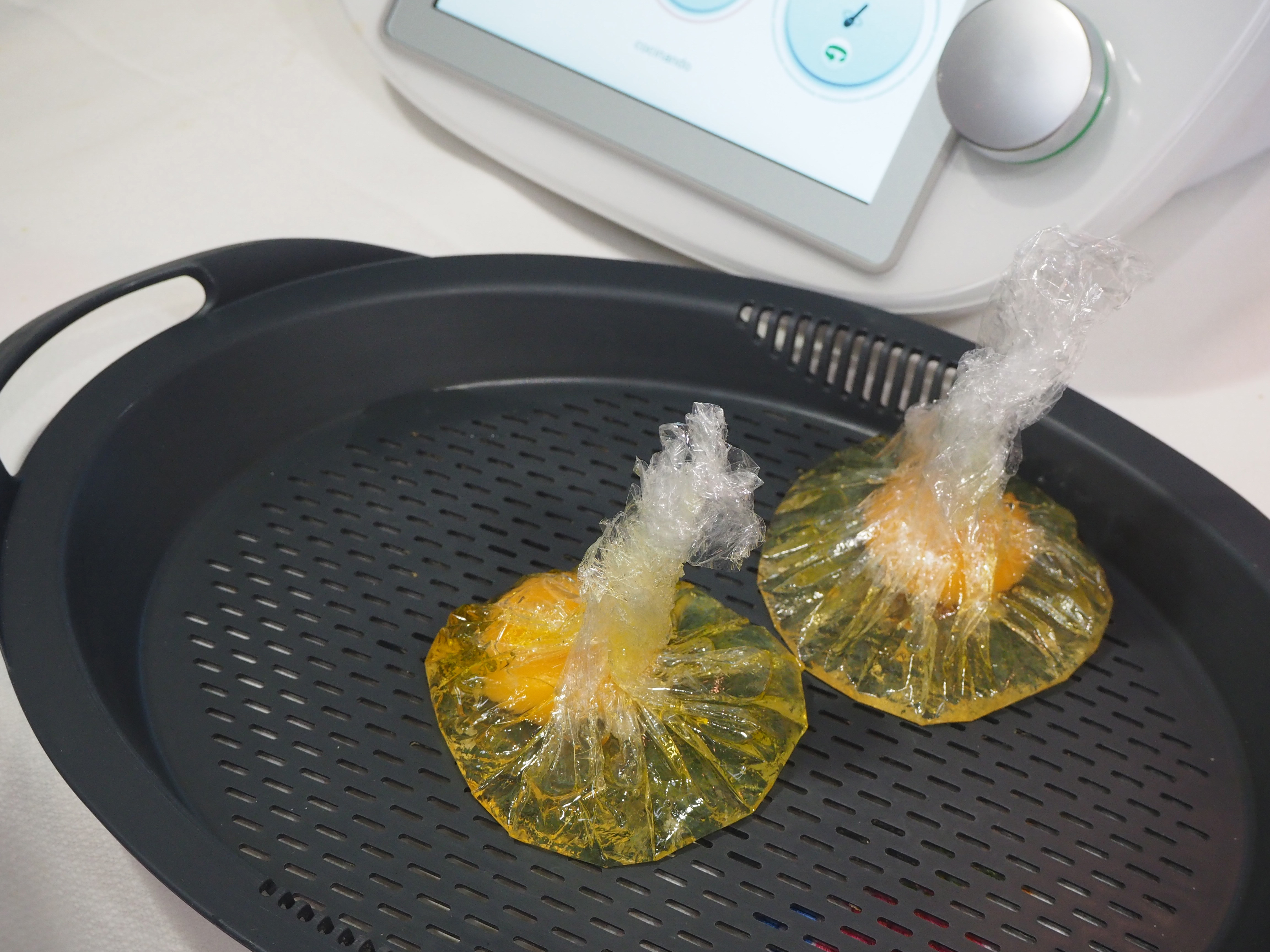 echamos un huevo con un poco de sal y con el film que sobresale enrollamos y hacemos un paquetito, los paquetitos los vamos poniendo en la bandeja del varoma