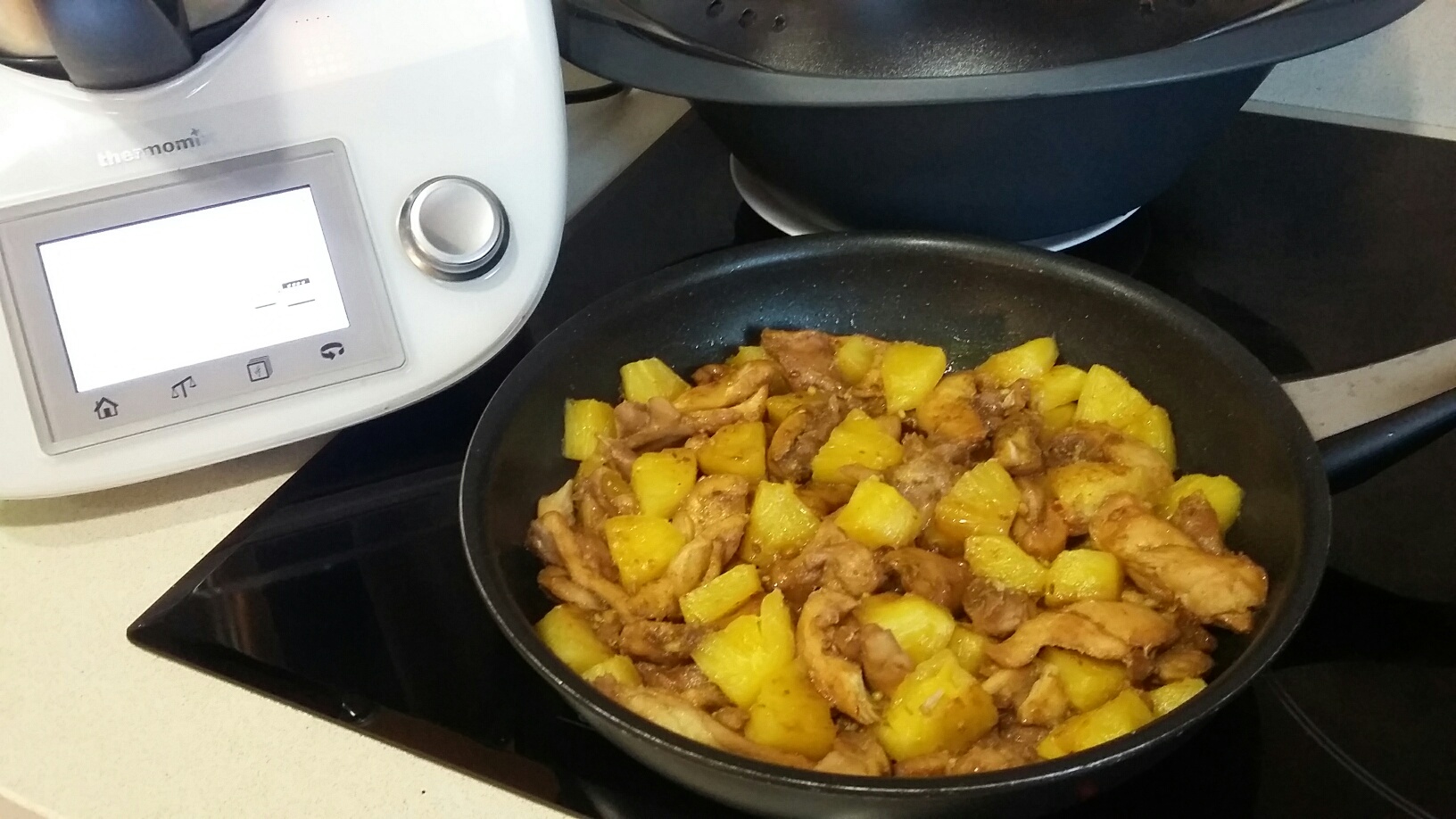 3. Retirar el Varoma y verter el contenido de la bolsa en la sartén junto con la piña. Cocinar a fuego fuerte durante 5-10 minutos hasta que la salsa se reduzca a la mitad y servir inmediatamente.