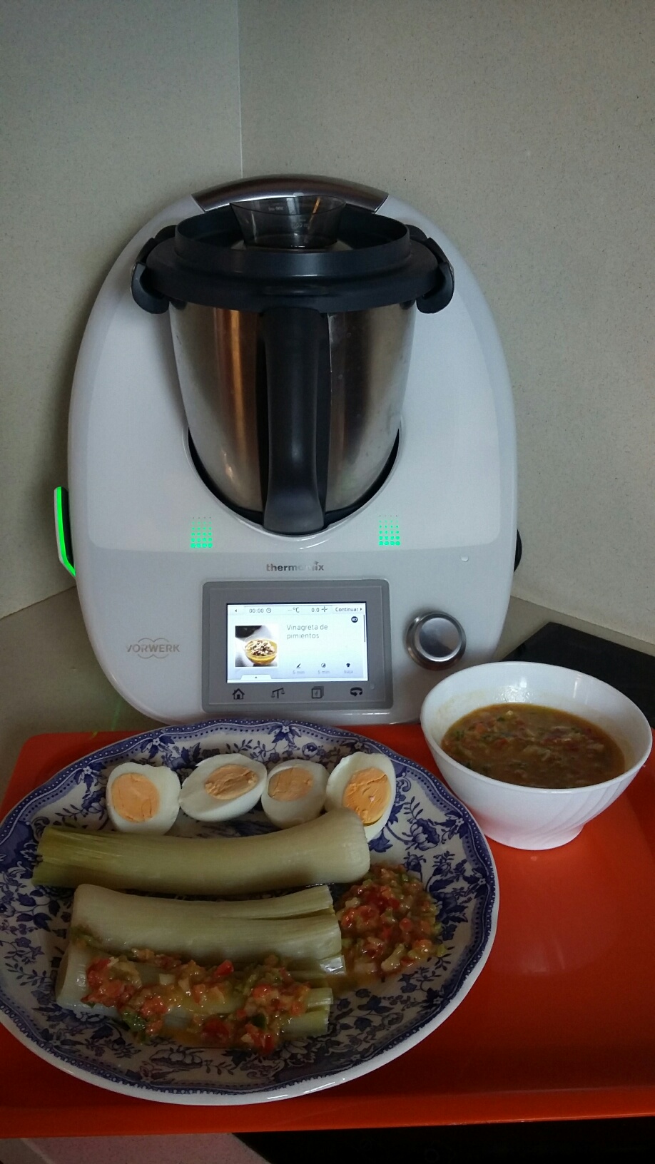 5. Pelar los huevos, cortarlos en cuartos y servir junto con los puerros cubiertos con una vinagreta de pimientos o al gusto.