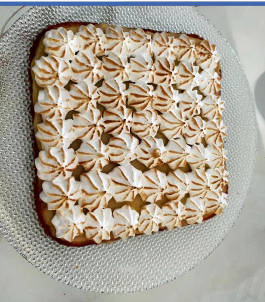 - Desmolde el bizcocho, cubra con la crema de limón y decore con el merengue. Finalmente dore con un soplete
