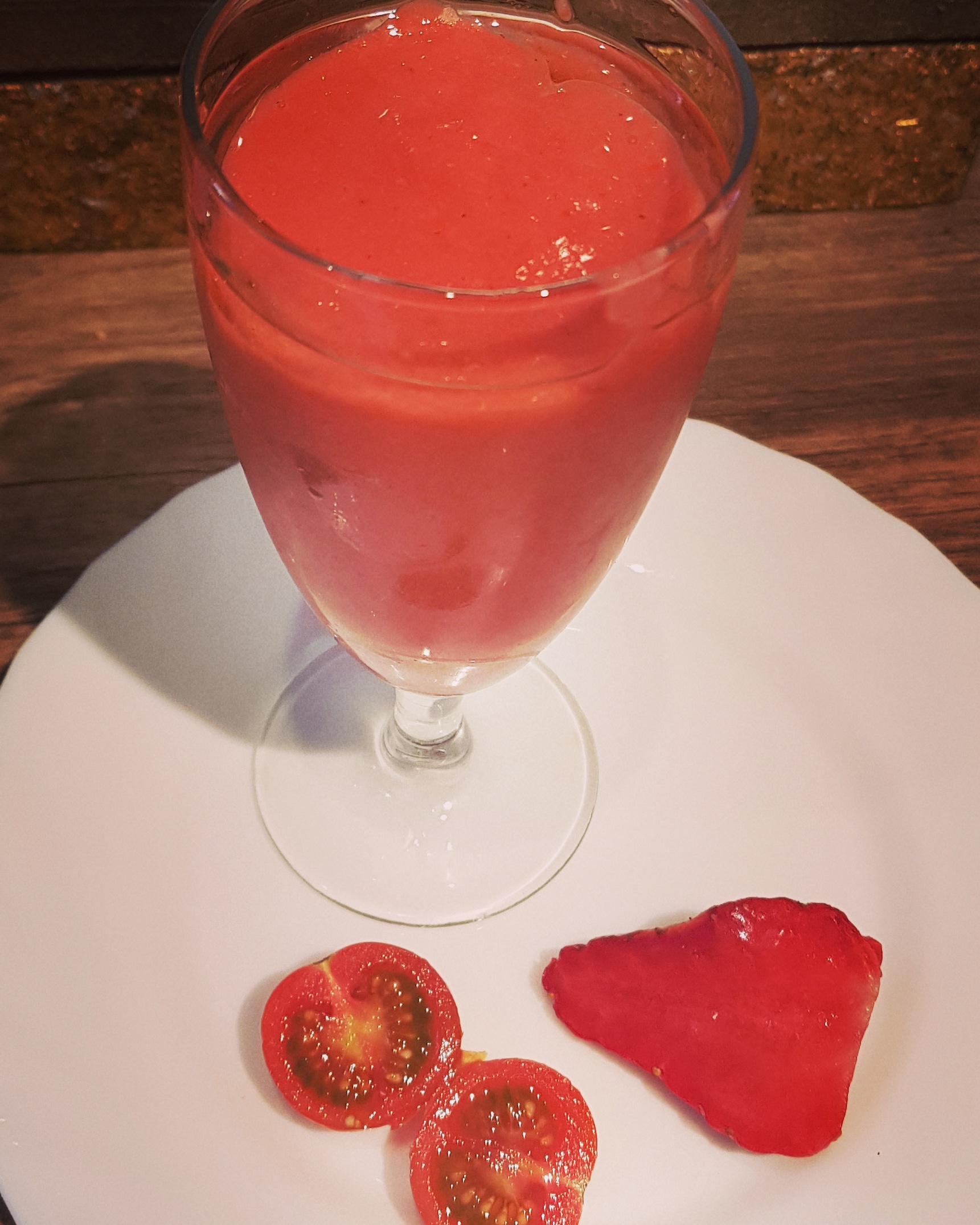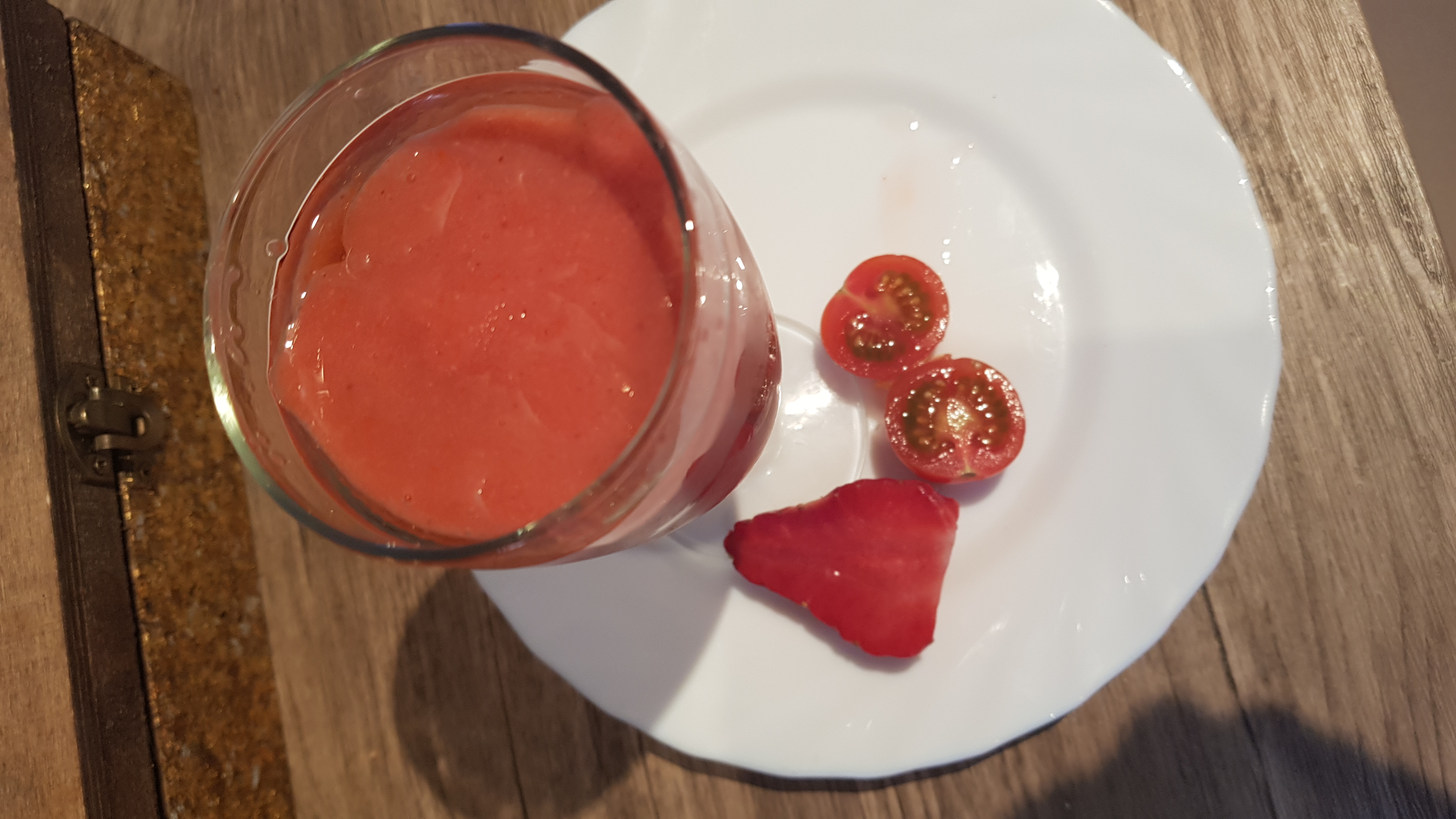 *Ingredientes: 200 gr de fresas limpias y sin tallos, 200 gr de tomatitos cherry, 50 gr de miga de pan, de 50 a 75 gr de agua, 1 ajo , 15 gramos de vinagre de manzana o 10 gr de vinagre de jerez ,una cucharadita de sal y un chorreon de aceite de oliva para enderezar.