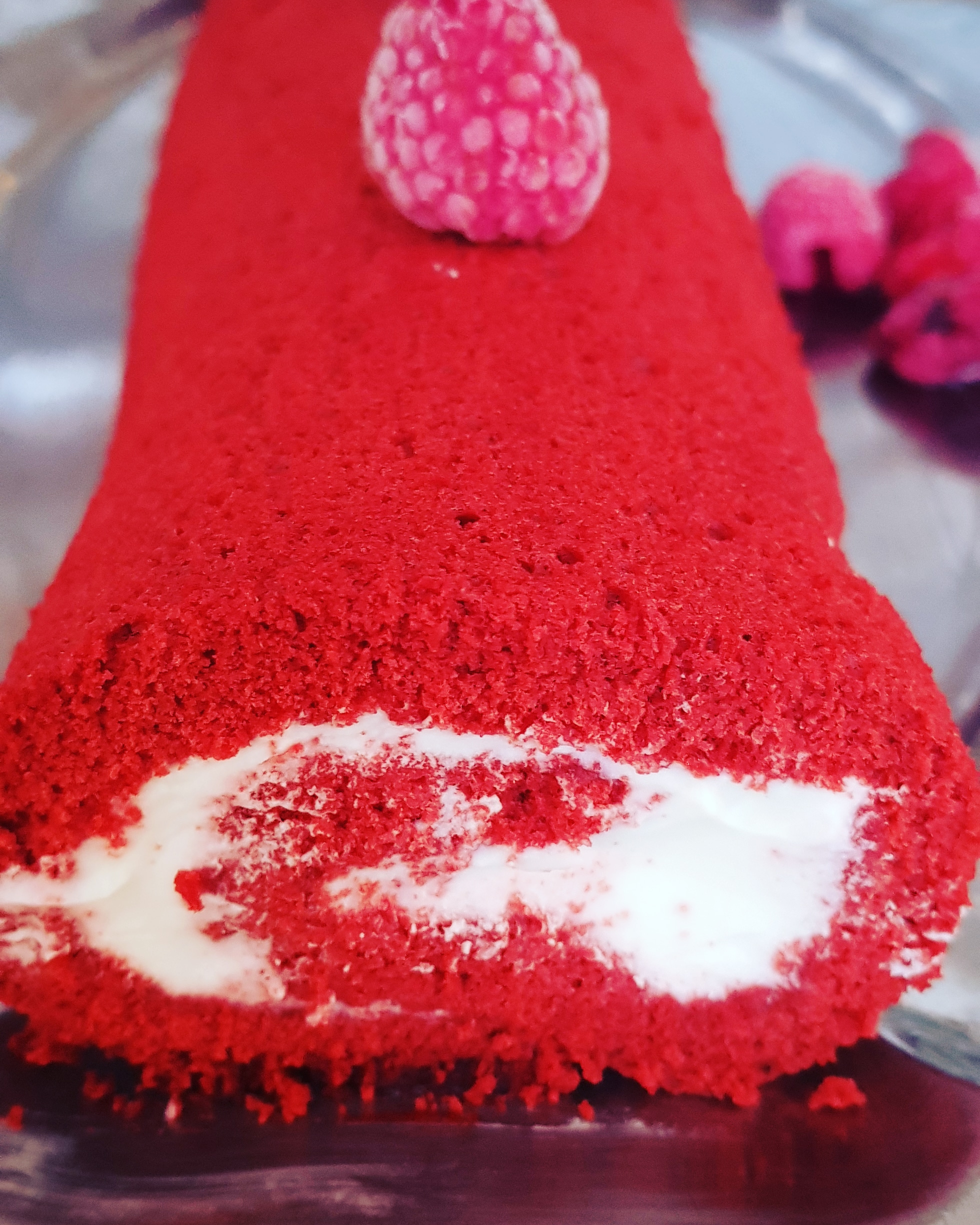 Una vez hecho este paso ,pasamos hacer el bizcocho genovés con el vaso limpio y seco y también la mariposa. Añadimos los huevos y el azúcar y programamos 6 minutos/ Temperatura 37°/ velocidad 3. Cuando termine vuelva a programar la misma velocidad y tiempo pero sin temperatura. Añada la harina , el cacao ,la sal y una cucharadita de colorante y mezcle unos segundos al velocidad 3. Termine de envolver con la espátula. Programe el horno a 200 ° . Forre una bandeja de horno con papel vegetal y extienda la masa en está dejando un grosor de 1u 2 cm ,siendo más gordito por las esquinas para poder manejarlo una vez hecho. Mantengalo en el horno de 10 a 15 minutos, seegun aprecien su acabado esponjoso, que no quede duro. Lo sacamos de horno y lo enrrollamos,lo metemos en la nevera a que enfríe. Después lo rellenando con la nata y decidamos al gusto.