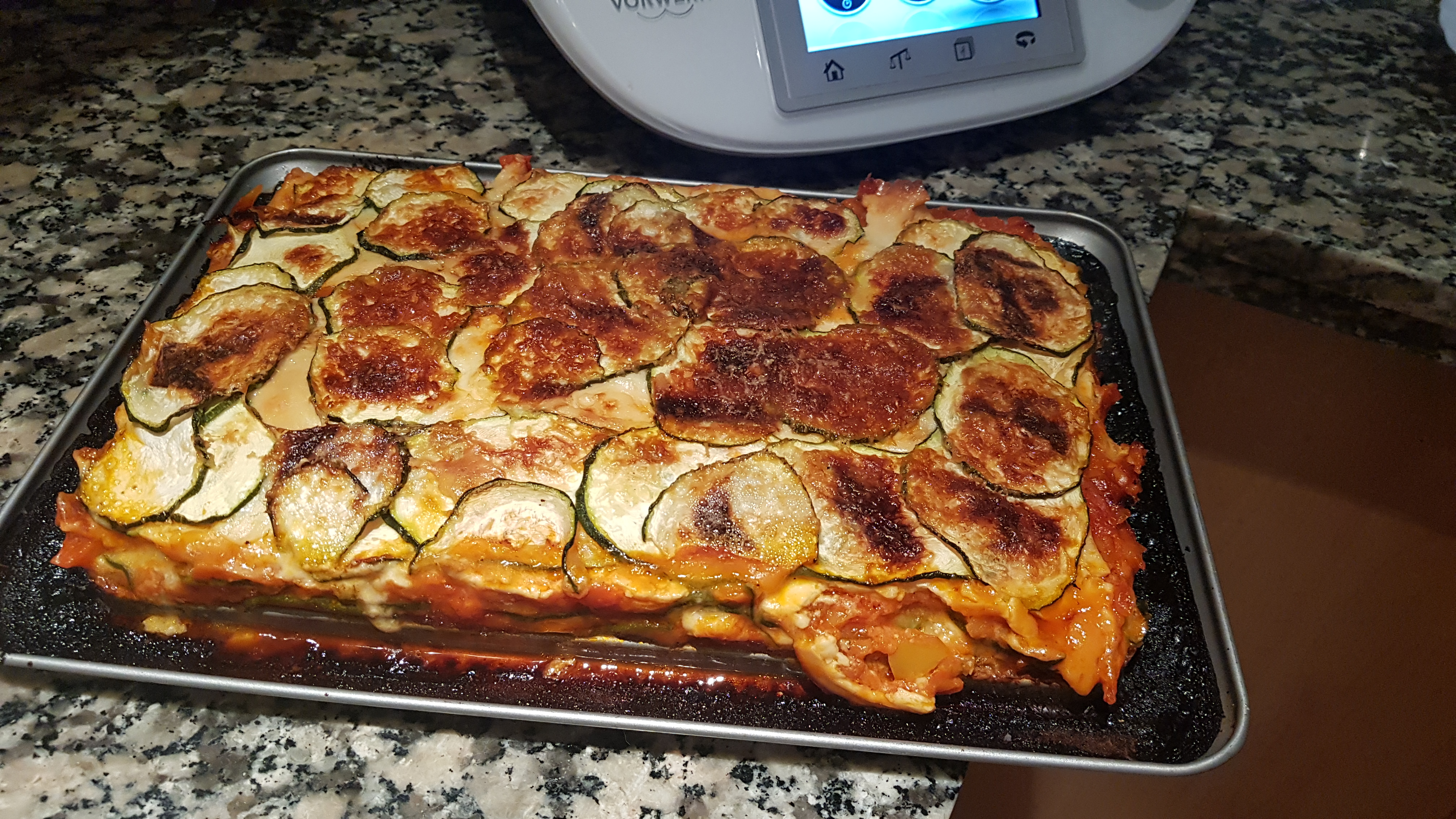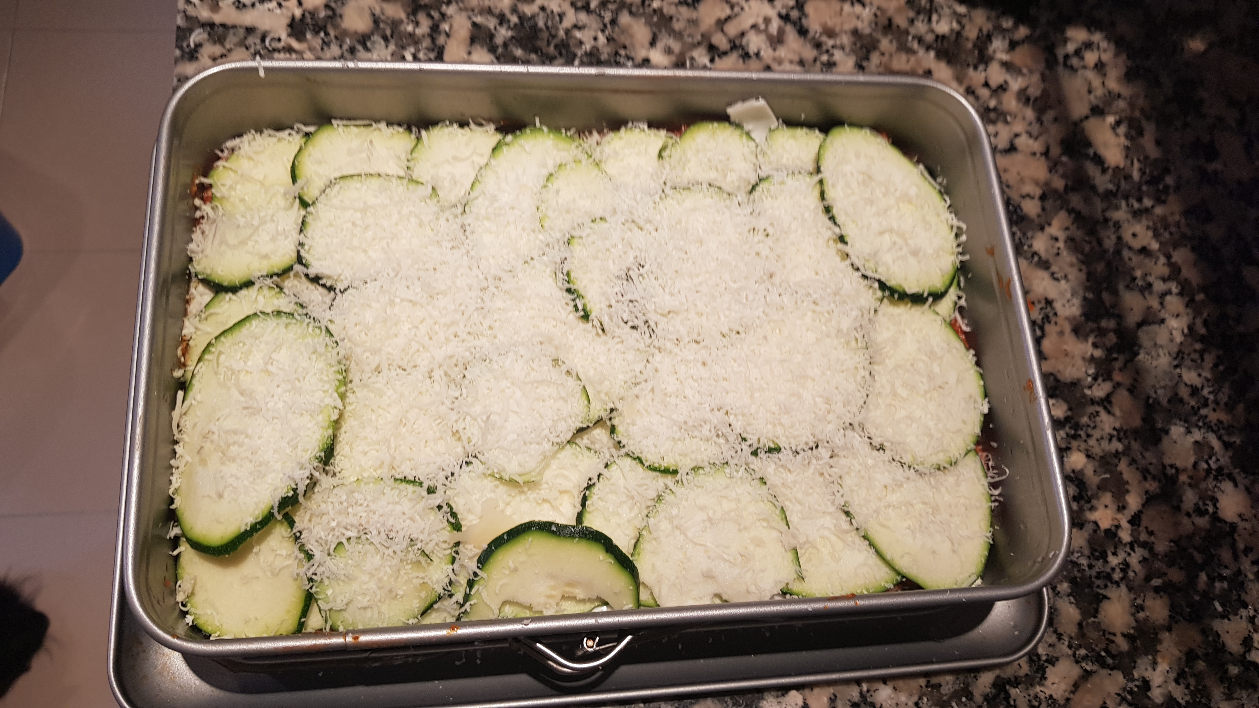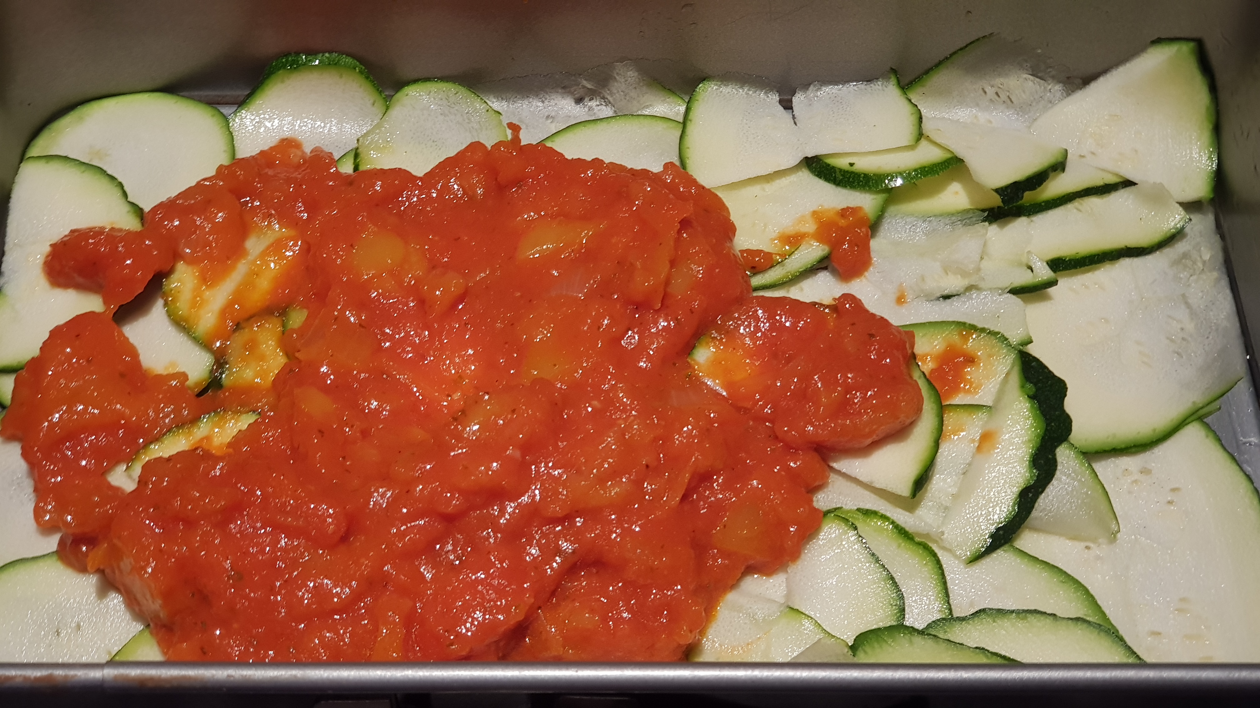 -Unte de mantequilla un molde y con una mandolina corte muy fino los calabacines.La primera capa de calabacines,la segunda capa de pisto, la tercera de queso de lonchas y así hasta acabar con la capa de calabacines, y por último el queso rallado .Meta en el horno 15 minutos y gratine.