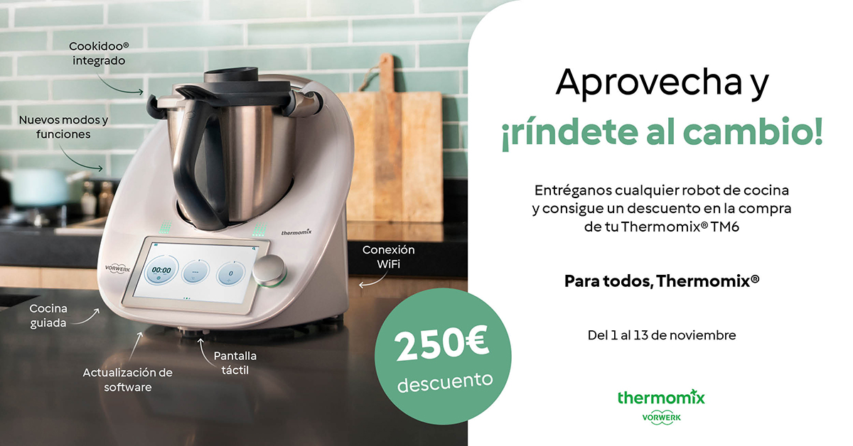 Desde el 31 de octubre hasta el 13 de noviembre, ¡ríndete al cambio! Entréganos cualquier robot de cocina y consigue un descuento en la compra de tu Thermomix TM6 de 250 euros.