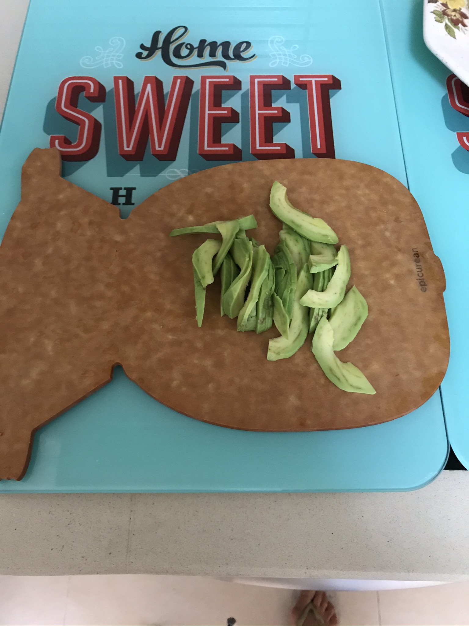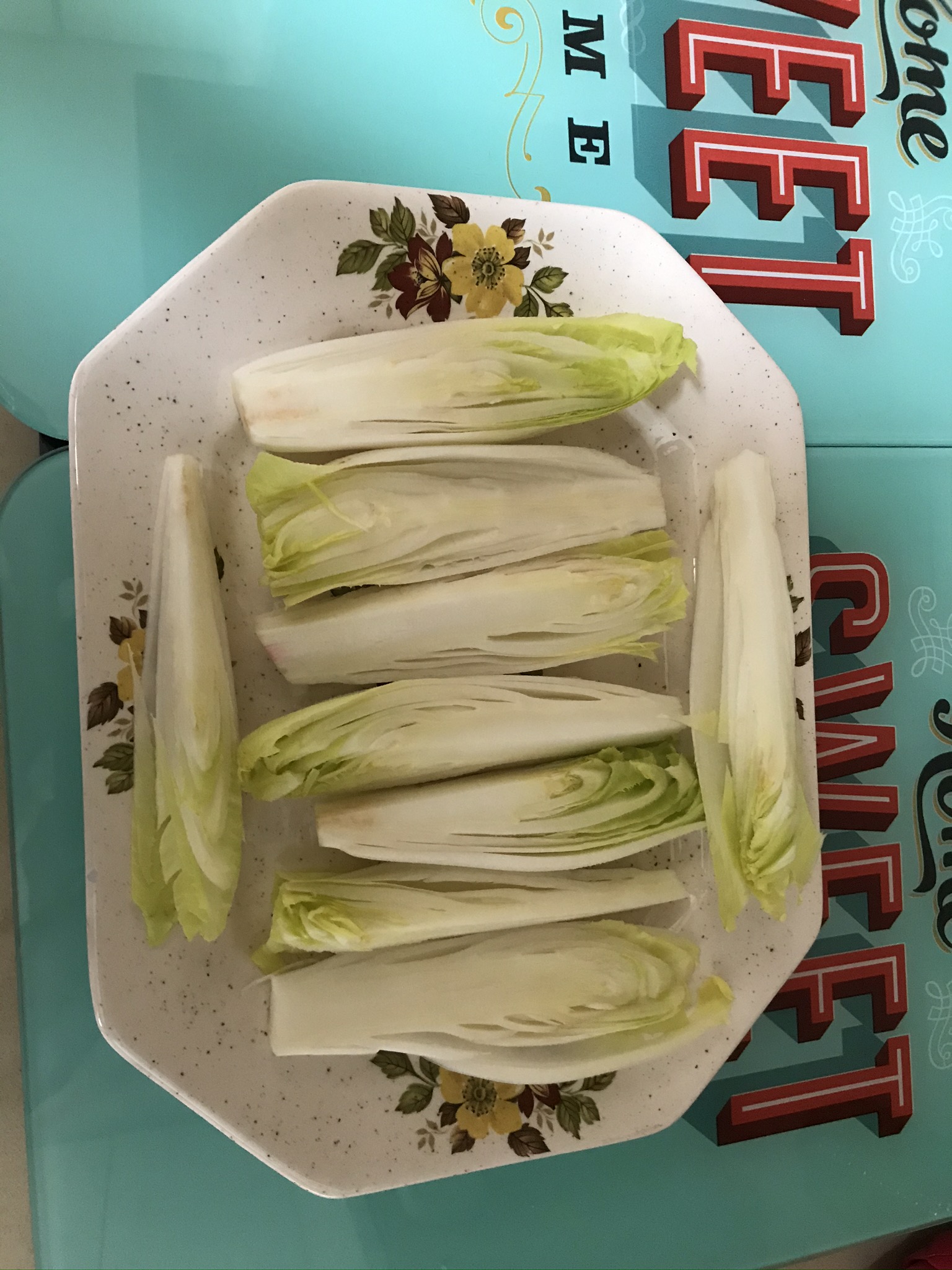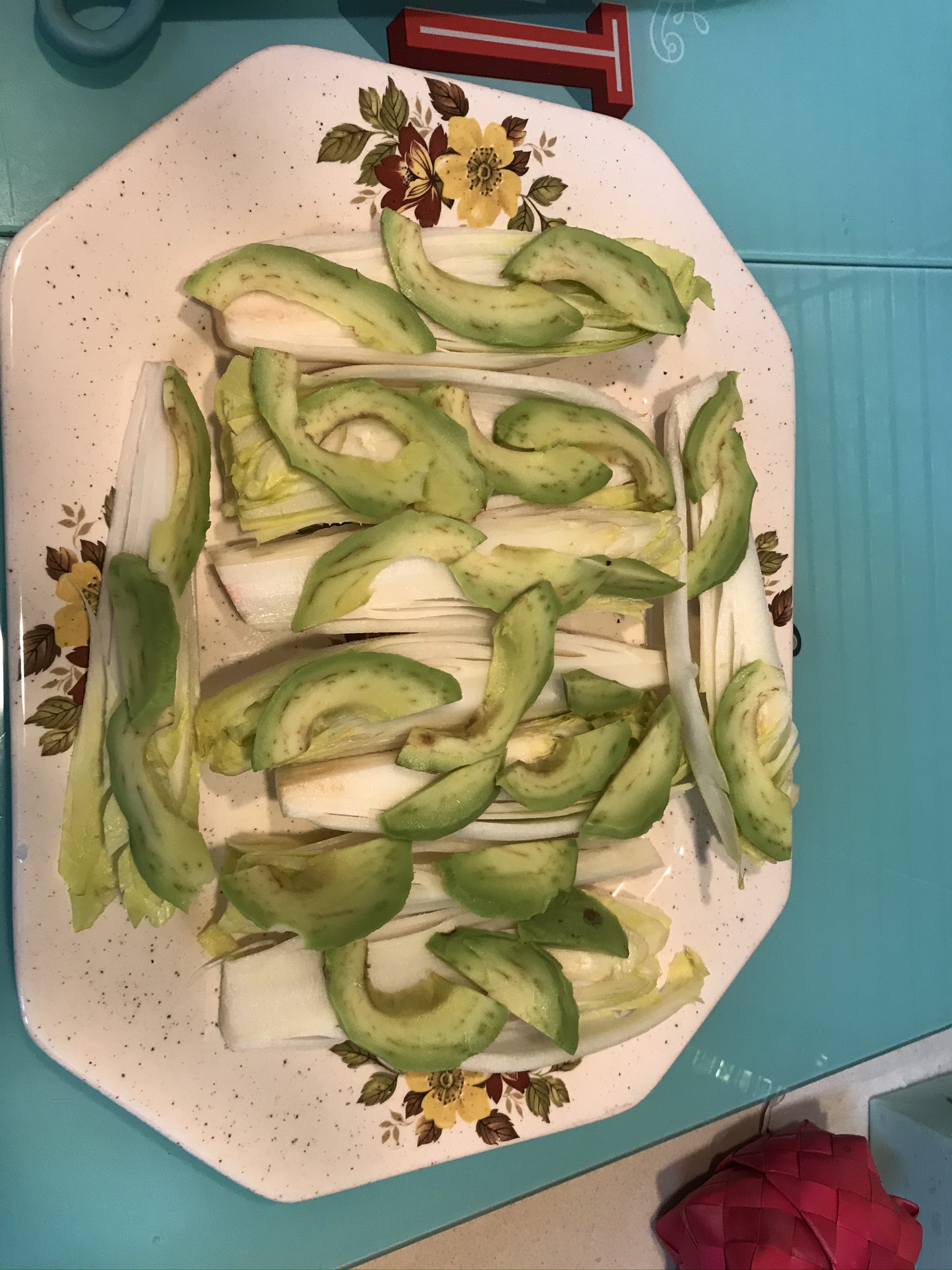 Mientras tanto, cortar las endivias en cuartos y disponer en una bandeja. Pelar y cortar el aguacate en láminas y colocarlas sobre las endivias.