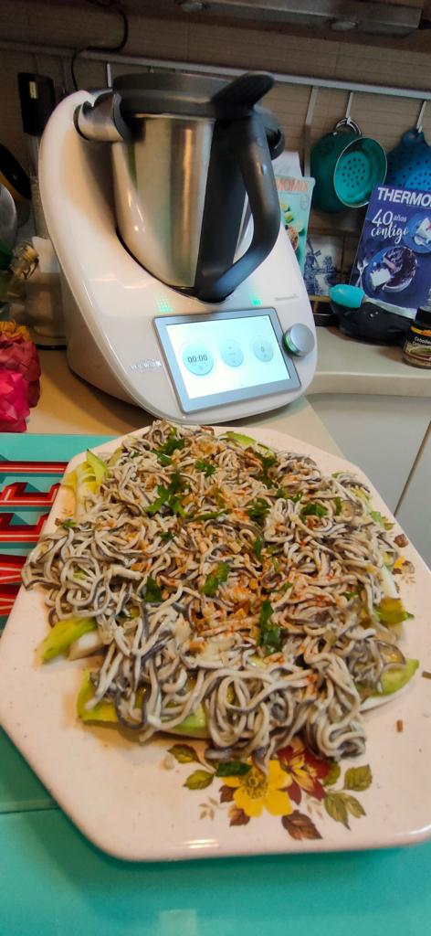 Colocar la mariposa y añadir las gulas 3 min/120º/vel cuchara giro inverso, sin cubilete y con la rejilla anti salpicaduras. Colocar las gulas sobre las endivias y el aguacate, añadir un poco de aceite de oliva, vinagre, sal en escamas, un poco de perejil picado y pimentón dulce.