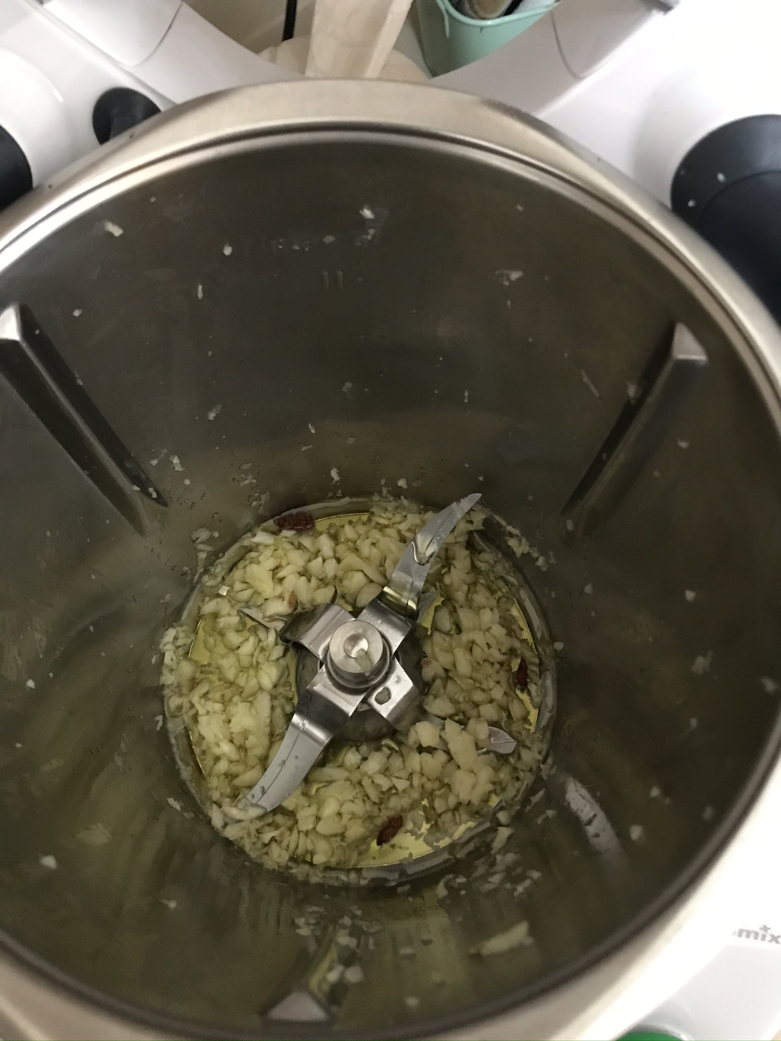 Poner en el vaso los ajos pelados y programar 2 seg/vel 5. Bajar con la espátula los restos delas paredes del vaso y añadir el aceite. Programar 10 min/120º/ vel cuchara giro inverso, sin cubilete y con la rejilla anti salpicaduras.