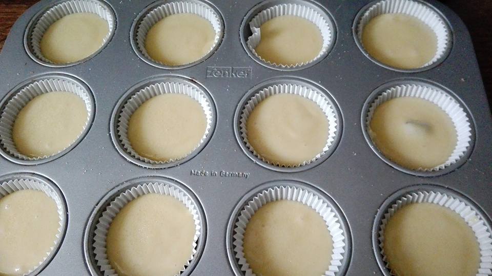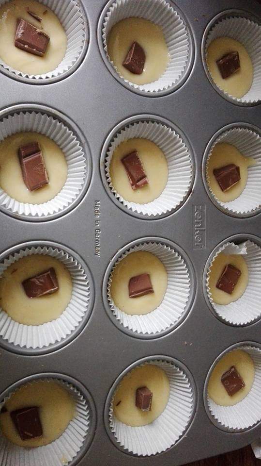 - Mientras se calienta el horno echamos un poco de la masa en cápsulas, le ponemos una onza de chocolate y vuelvo a echar un poco más de masa de magdalena dentro de un molde rígido para muffins. Rellena ¾ partes o un poco más de cada cápsula y espolvoreamos con azúcar la superficie de cada magdalena.