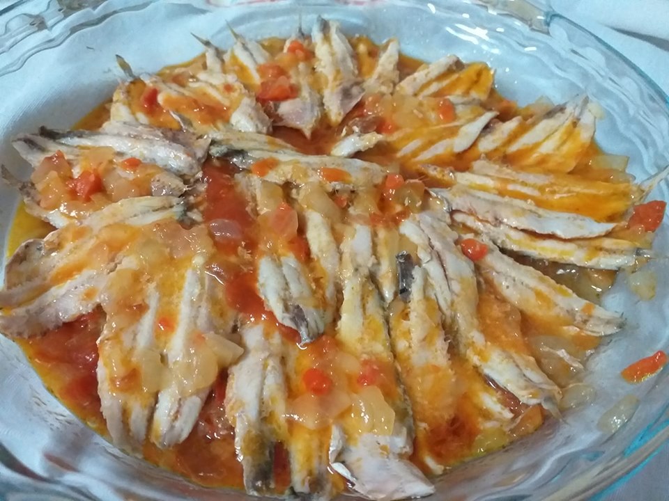 Con este última forma de preparación, ya no haría falta meterlo en el horno directamente se pone en una bandeja el sofrito y encima los boquerones. Listo para comer.
