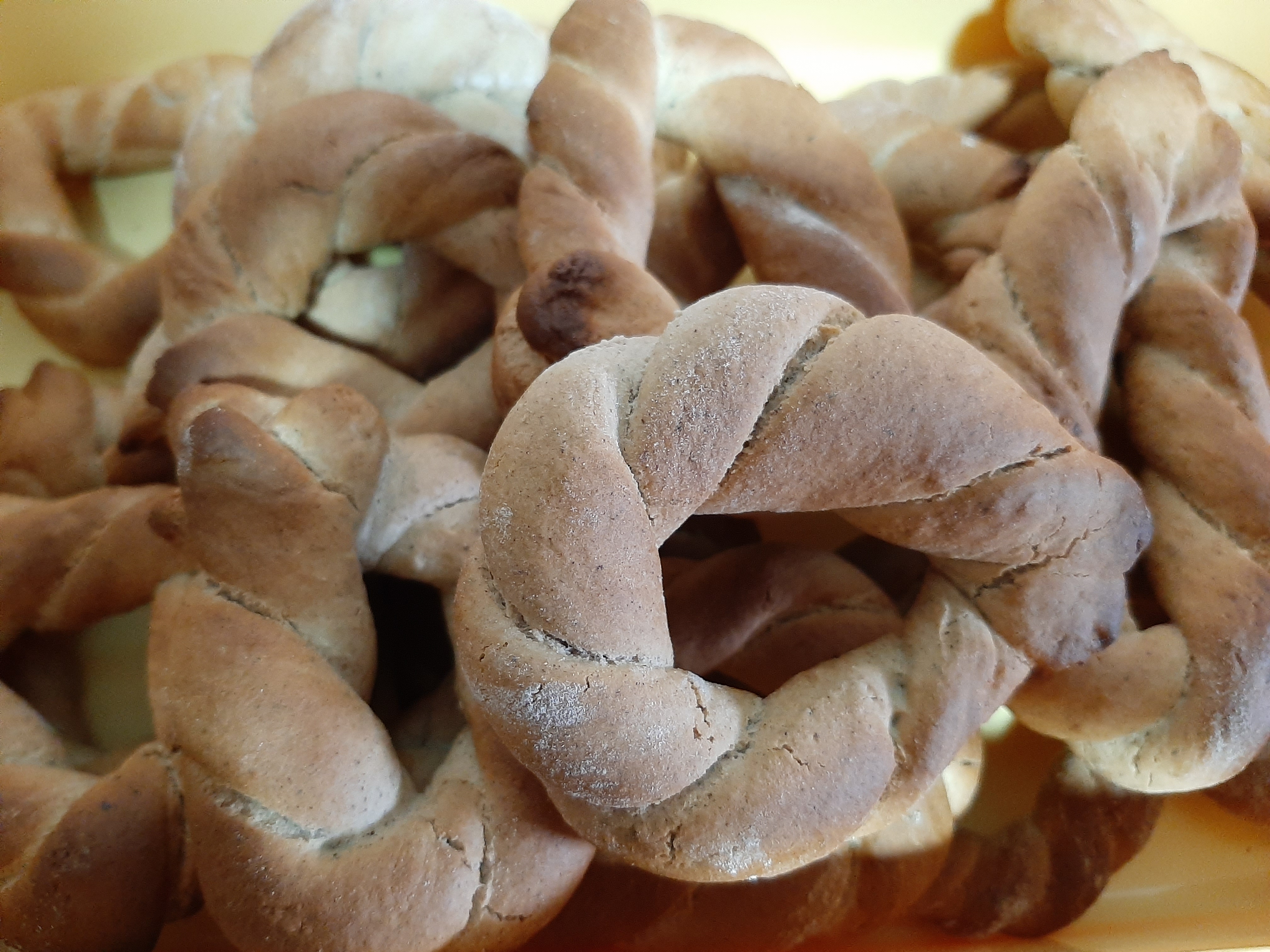 4. Dejamos reposar la masa. La colocamos sobre una superficie enharinada. Retiramos bolitas y le damos forma de rosquilla que iremos colocando sobre una bandeja de horno forrada con pepel de hornear. Las horneamos a 180º (horno precalentado) durante unos 15 minutos.
