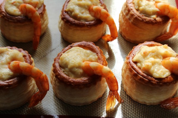 4- Rellenamos los volovanes, adornamos con un langostino crudo y al horno precalentado a 200º, durante 10-15 minutos.